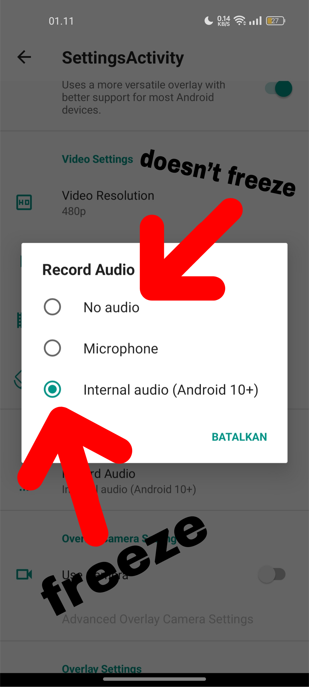 But when I record the screen with audio turned off, it does not freeze.
