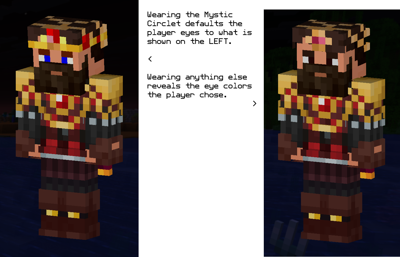 When worn, the headwear item called Mystic Circlet causes the eye colorations that the player had chosen to be overriden by a default color scheme. The colors that the player chose are still correct, but they are visibly changed to a default blue.