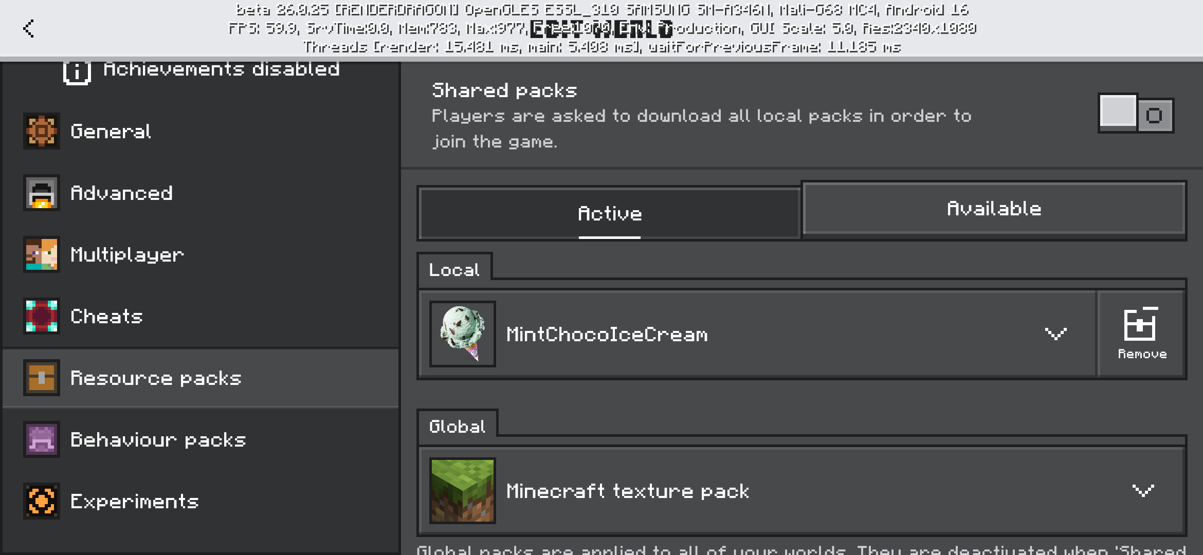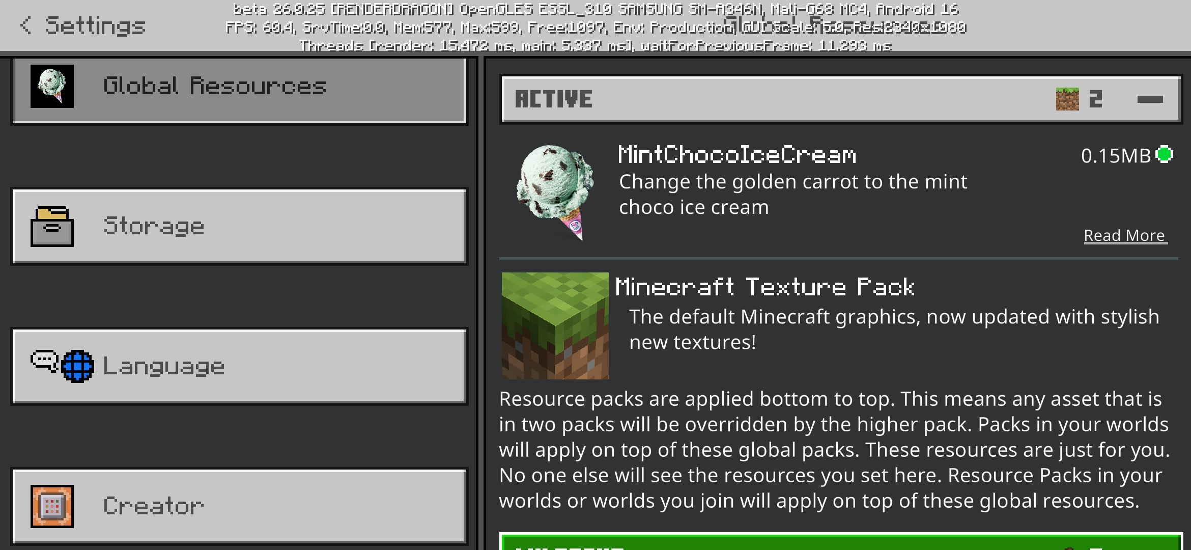 I've tried uninstalling and reinstalling Minecraft, but global resources still don't work. Regardless of the size or number of packs, they don't apply to the map. It's not a pack issue; applying a resource pack to each map works fine.