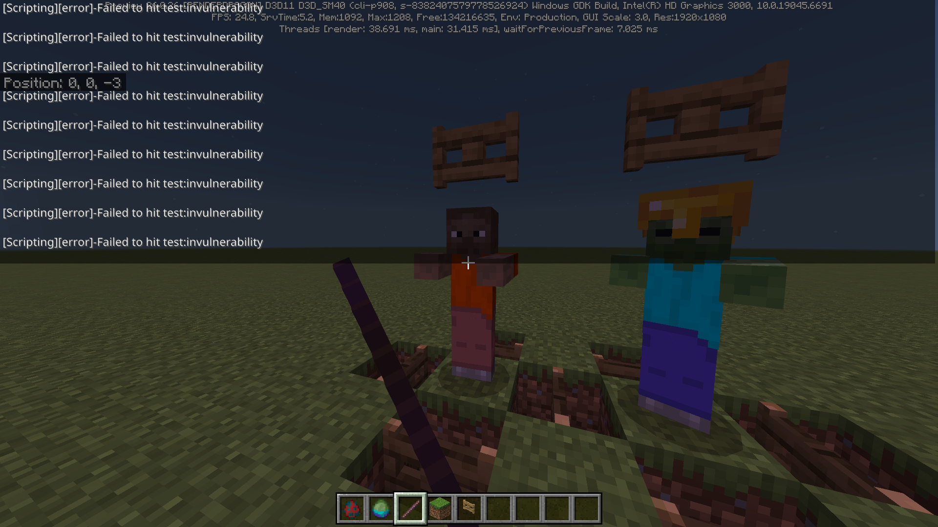 import { world, system, EntityDamageCause } from '@minecraft/server'; world.beforeEvents.entityHurt.subscribe(data => { // beta const { hurtEntity: { typeId }, damageSource: { cause } } = data; if (cause !== EntityDamageCause.entityAttack || typeId.startsWith('test'')) return; data.cancel = true; }); system.beforeEvents.startup.subscribe(({ itemComponentRegistry }) => itemComponentRegistry.registerCustomComponent('test:before_damage', { onHitEntity: ({ hitEntity, hadEffect }) => console.log(`${hadEffect ? "Successfully" : "Failed to"} hit ${hitEntity.typeId}`); }); );Hit the entity and a vanilla mob for different results