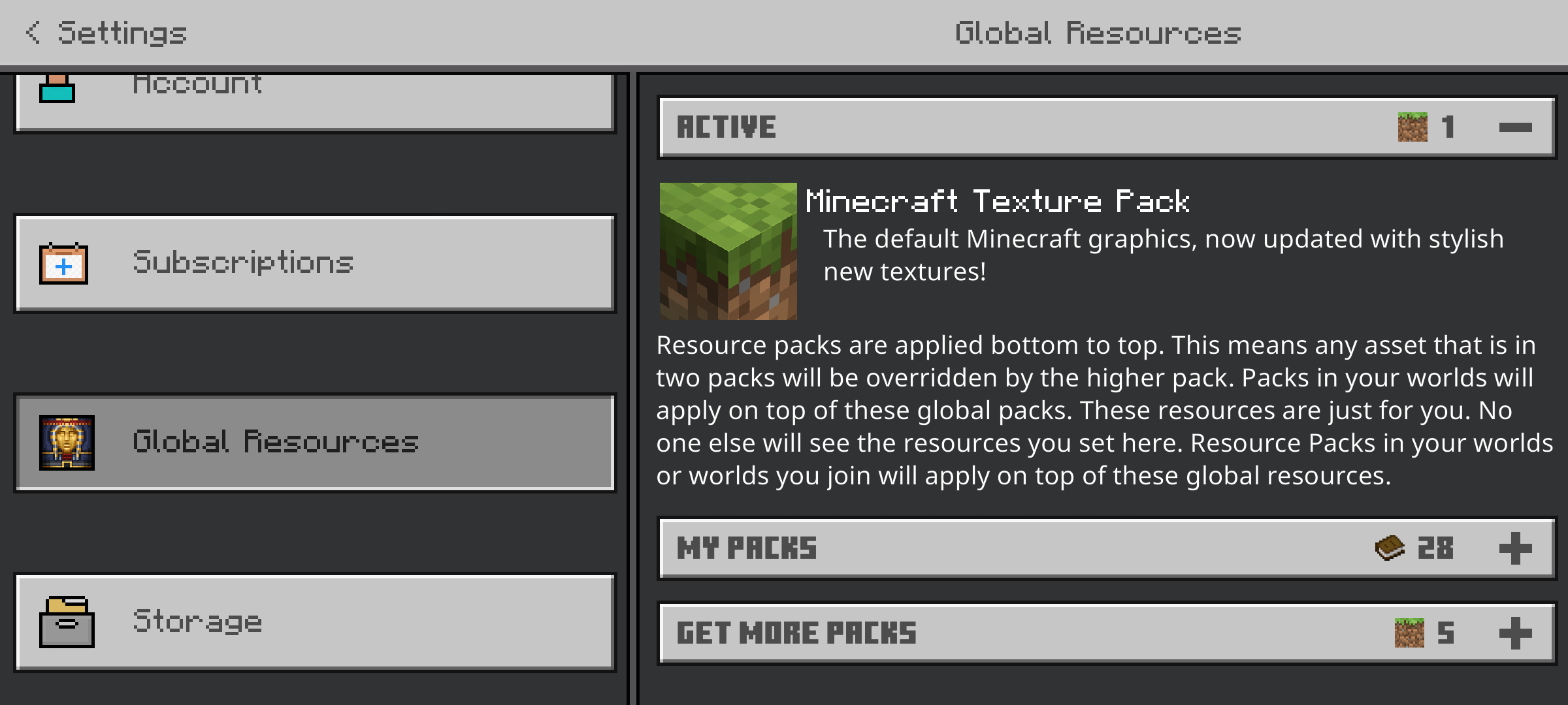 Please attach a screenshot of Settings > Global Resources and the resource packs tab of your world.