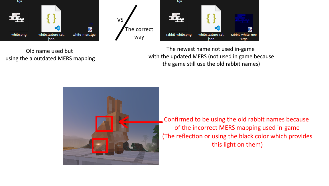 In today’s preview, rabbit model was updated as well as their textures. However, the name used are the old one (for example “brown” instead of “rabbit_brown” or “white” instead of “rabbit_white”) which also makes their updated MERS mapping not working because of the old name still being used and making use of the outdated MERS textures from the previous texture.