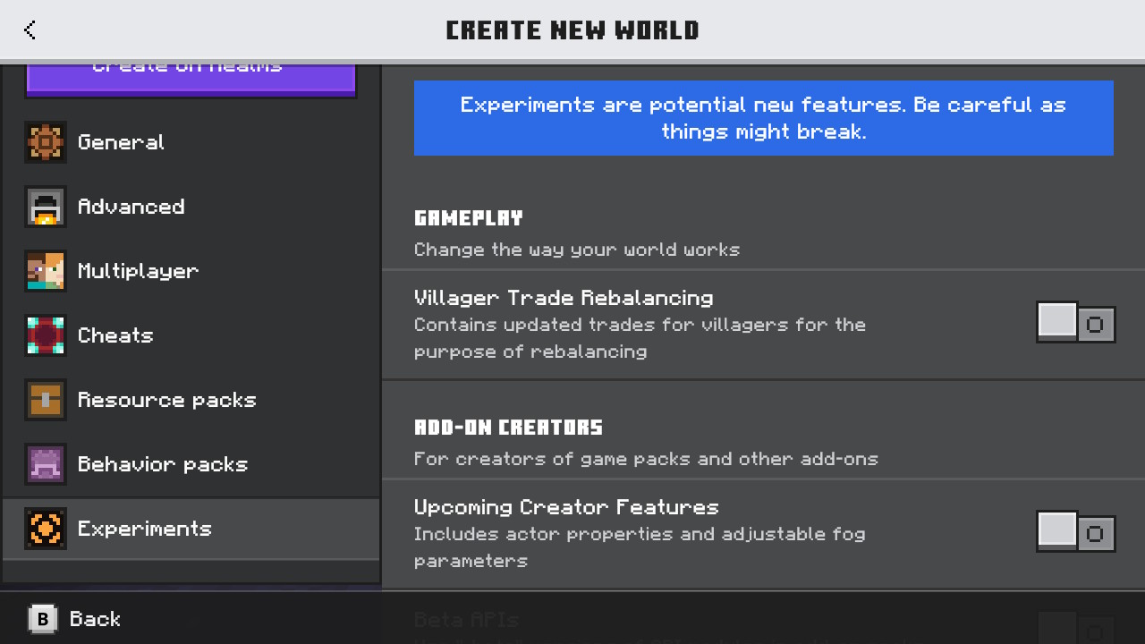 I do not know if this is an actual bug. But, the new drop for the baby mobs isn't showing in the experimental toggles. Is this just because it's the Switch? It's been like this for a while I think, I'm not sure if I could toggle on the previous drops. I can't remember