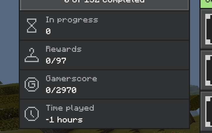 There's a bug in achievements where if you open the achievement and check on time it says -1h even though if you play the game for a long time, theres a problem that my account don’t get achievement i tried to do more accounts tried to look for tutorial how to fix it i even deleted Minecraft and reinstalled it making my 5700 days hardcore server to get deleted.