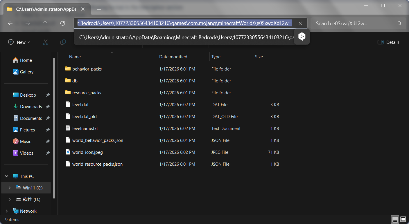 I wanted to edit my inventory the old way (by directly modifying the level.dat file to change my inventory), but later I found that the save file location has changed from C:\Users\Administrator\AppData\Local\Packages\MICROSOFT.MINECRAFTUWP_8wekyb3d8bbwe\LocalState\games\com.mojang\minecraftWorlds to C:\Users\Administrator\AppData\Roaming\Minecraft Bedrock\ Users\10772330556434103216\games\com.mojang\minecraftWorlds. Furthermore, I found that the latest version no longer allows modifying the inventory by directly editing the level.dat file. The internet tells me player data in the latest version has been moved to a separate folder named βplayers,β which should be in the same directory as level.dat. However, when I checked, there was no players folder. Even after creating a new folder named βplayersβ and launching the game once, the newly created folder still didn't load player data. This prevents me from editing my inventory. Is this caused by the migration to UWP? I installed Minecraft for Windows via the Microsoft Store. How should I resolve this problem?