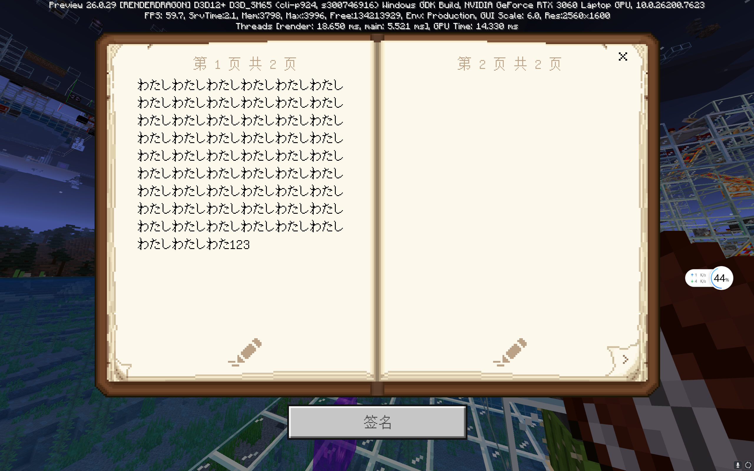 In the latest beta version 26.0.29, a new, stricter character or data volume limit has been silently applied to individual pages of written books. When a single page is filled with high-data-volume characters (such as Chinese or Japanese, which typically require more bytes per character in UTF-8 encoding), and the total data size exceeds an unspecified threshold, closing the book causes the game to crash. This issue does not occur with lower-data-volume text (e.g., English) on the same page, nor does it appear in the latest stable release (1.21.132), indicating a regression introduced in the beta.