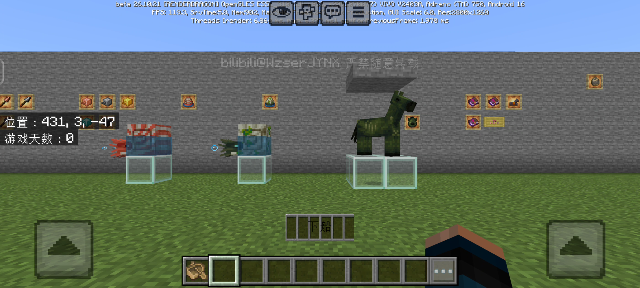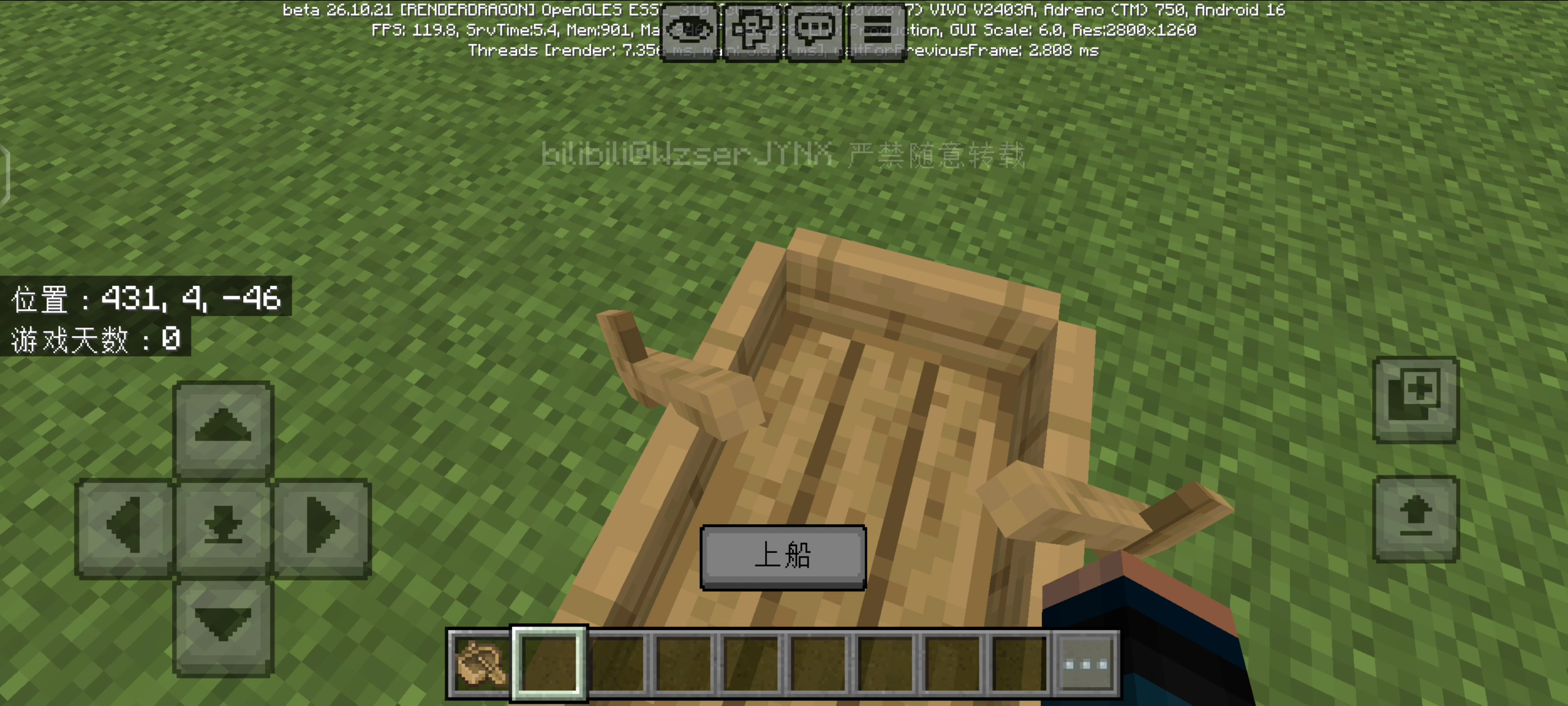On Minecraft Bedrock Edition (version 26.10.21), when interacting with certain entities with the boat when using "D-Pad & tap to interact", the "Mount/Dismount" button's texture is rendered incorrectly. The button appears blank or uses a mismatched texture, unlike the properly displayed buttons for other entities like the Zombie Horse. This issue is clearly visible in the provided screenshot where the button for the Strider lacks the expected visual details, while other entity interaction buttons function normally.