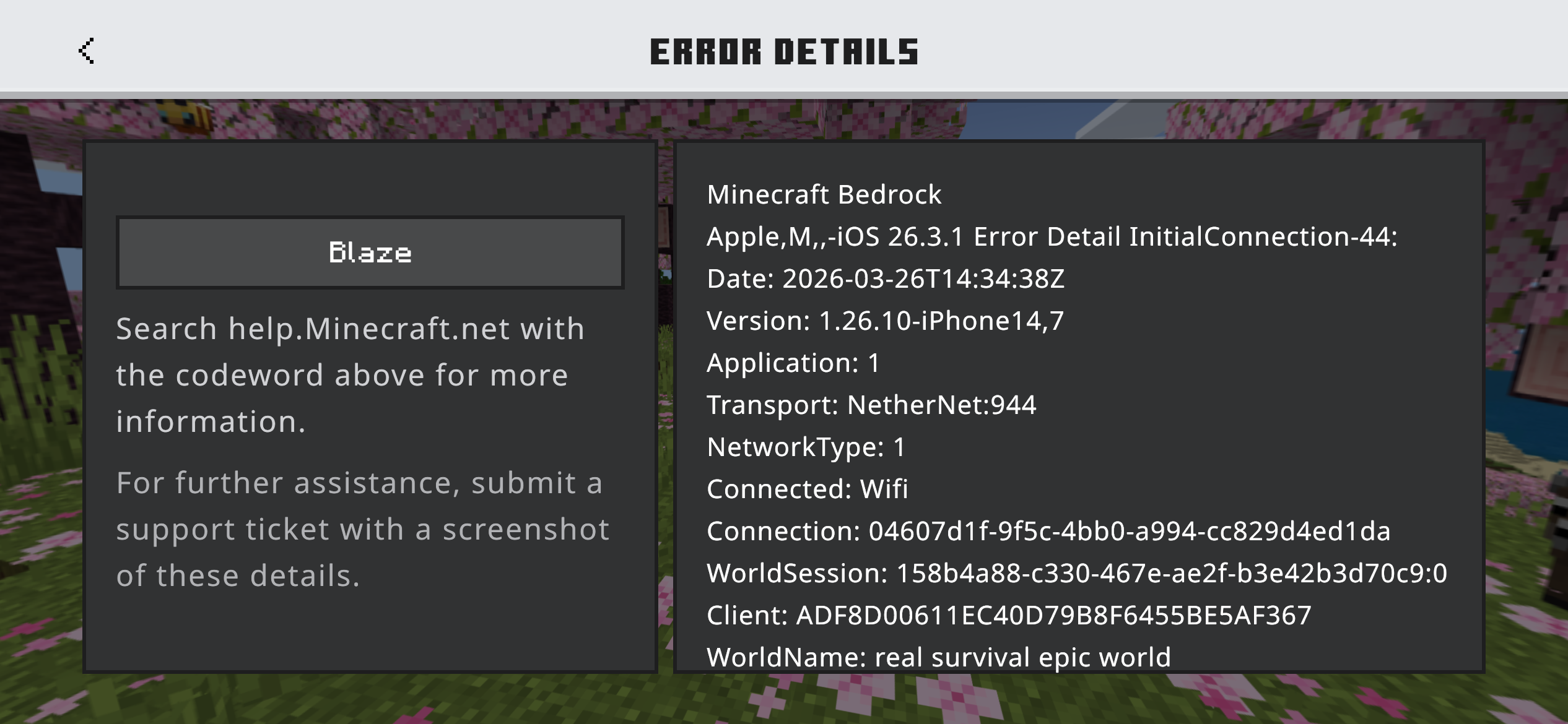 Post 26.10 update, attempting to join the LAN world on IOS results in the “Blaze” error code. Even when signing out of the Microsoft account on IOS and signing into a different Microsoft account on IOS the same issue persists.