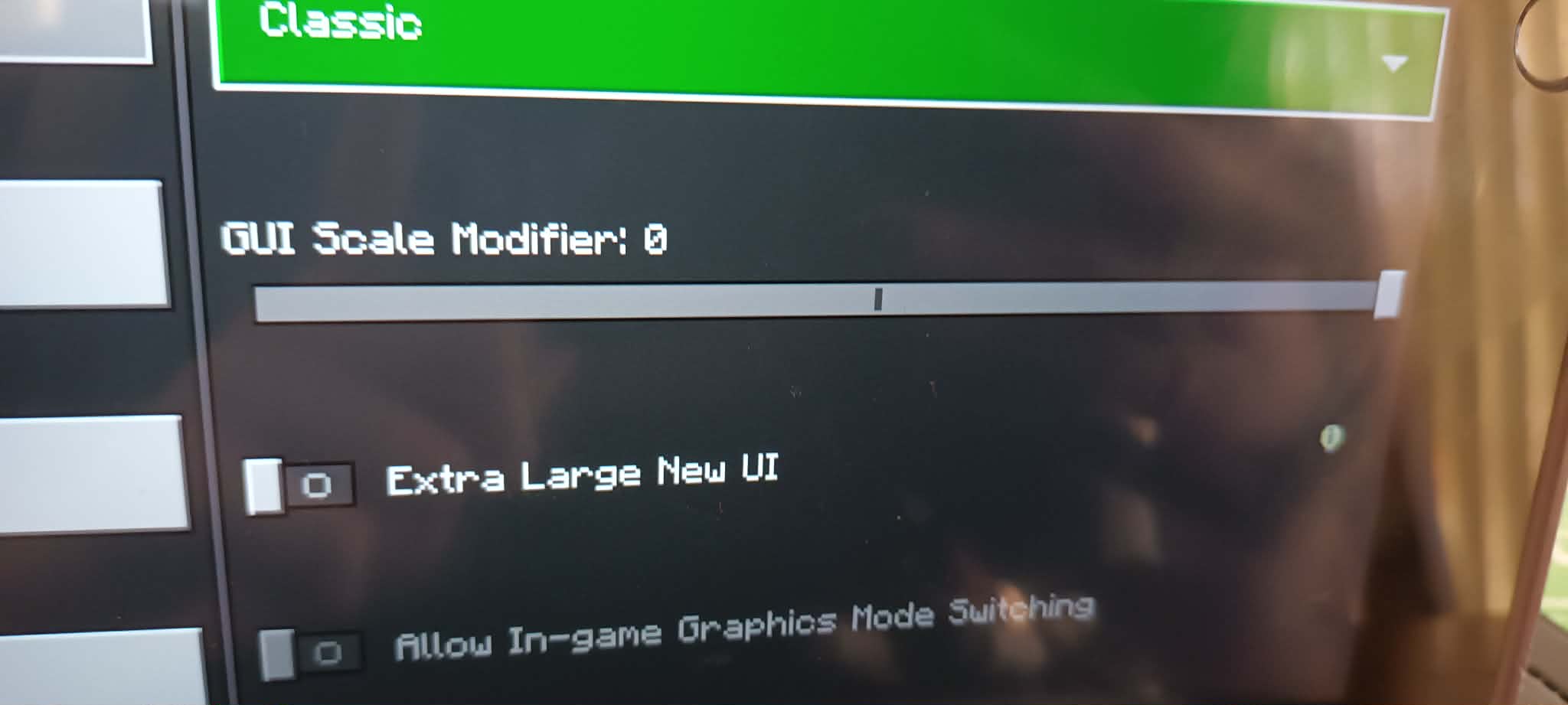 I have had the same issue, with the UI not able to be made bigger than 0. The extra large UI switch does not work. I have not been able to see the blocks in my hotbar or inventory as they are too small. The D pad is huge and the size can’t be changed. I have taken pictures with my hand to show the size comparison.