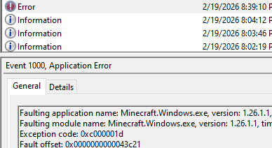 Looking in the Event Viewer, there is an error with exception code 0xc000001d and fault offset 0x0000000000043c21. I have tried a clean install of both Minecraft and the launcher, signing out and back in, and trying on other devices (which this does not occur on). My PC has an Intel Core i7-4790k.