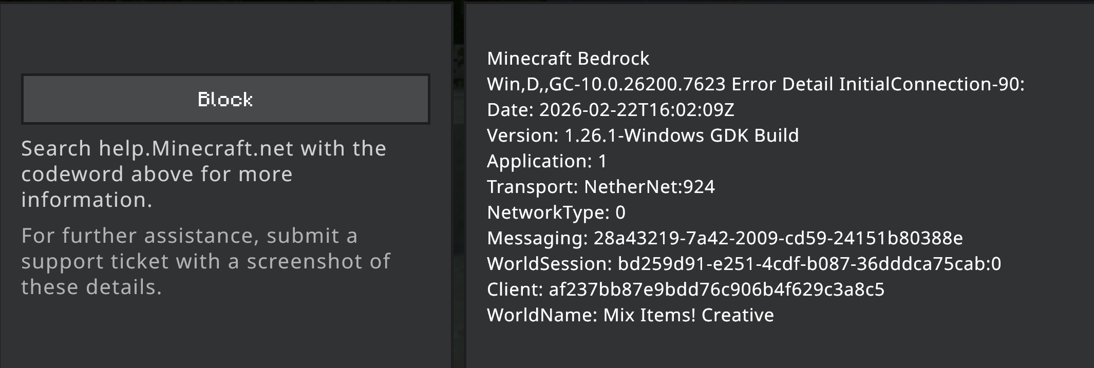 I’ve had this problem for months and have tried fixing it several times using different methods, including completely uninstalling and re-installing, but I can’t get past the error. Today, I updated the game and still get the error. The error “Block”. I’ve attached a screen shot. I have Java and Bedrock editions installed and I get the error on both editions.