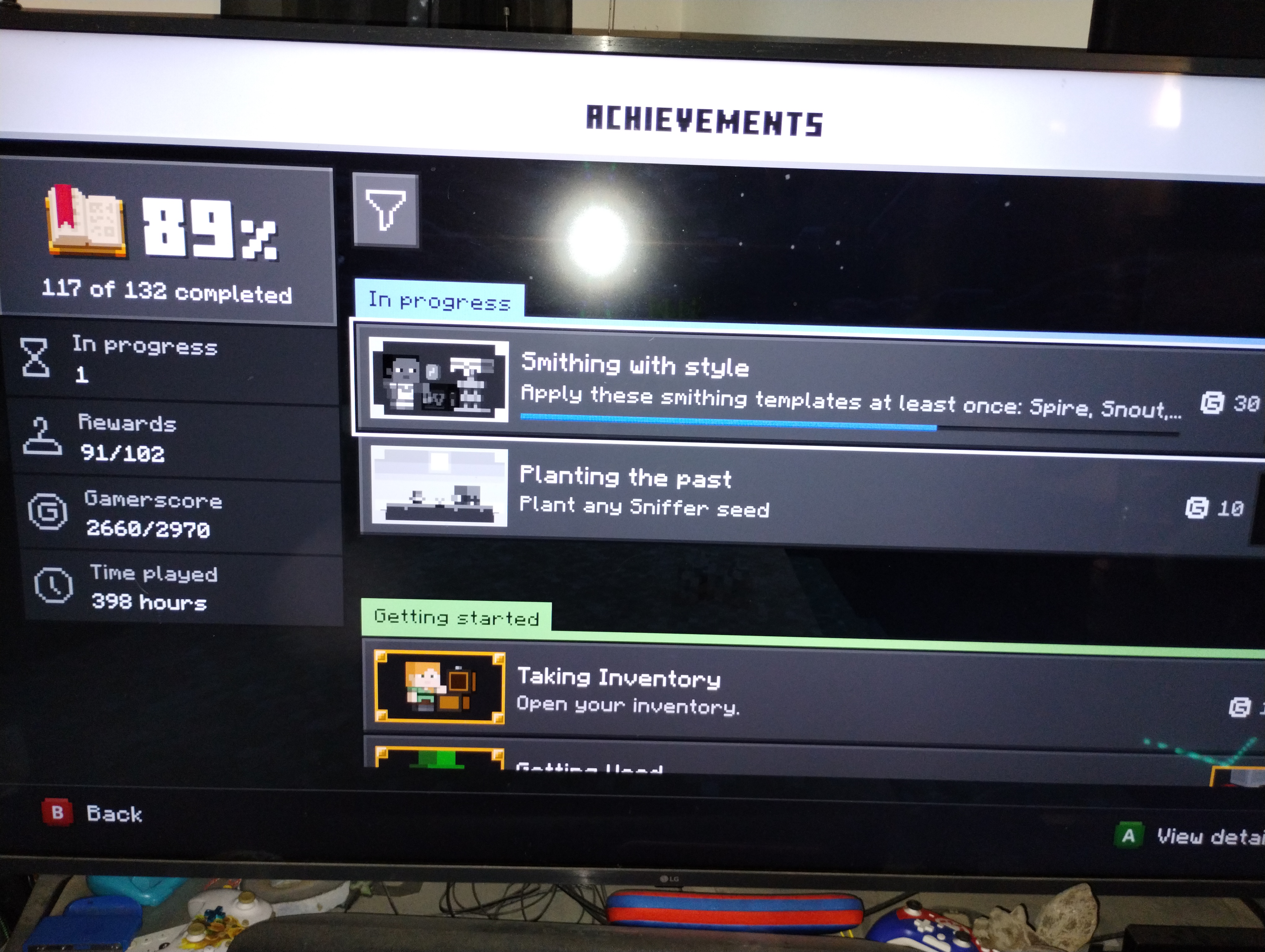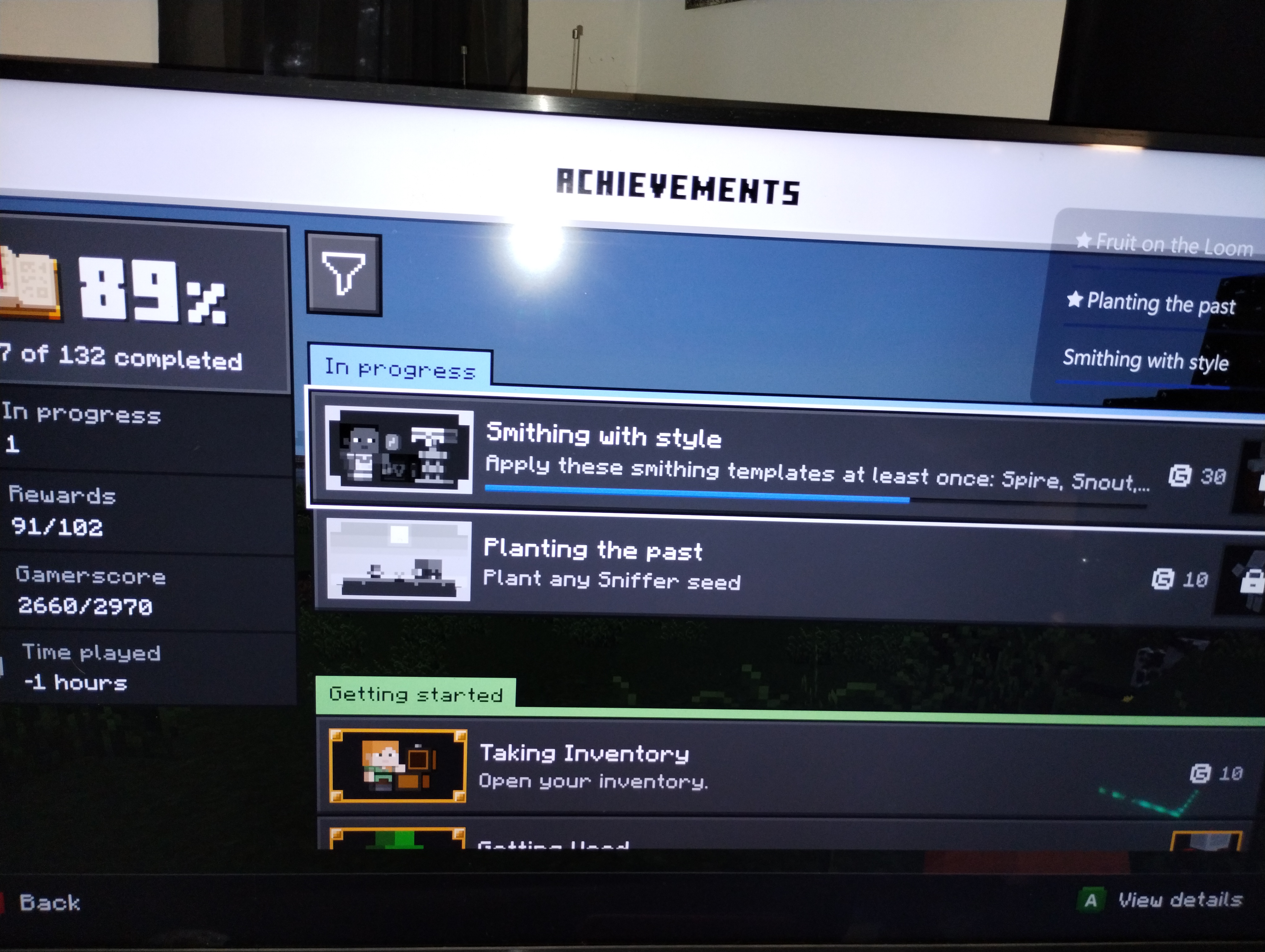 Achievements stopped updating in my world. It's in survival and there is no achievement disabled message. The only thing I see is that under play time, it's showing -1. Attached to this is a picture of the issue as well. I met the requirements for a couple of the achievements, but nothing popped and I found the ward trim and used it, but the tracker still shows 5/8 and never updated.