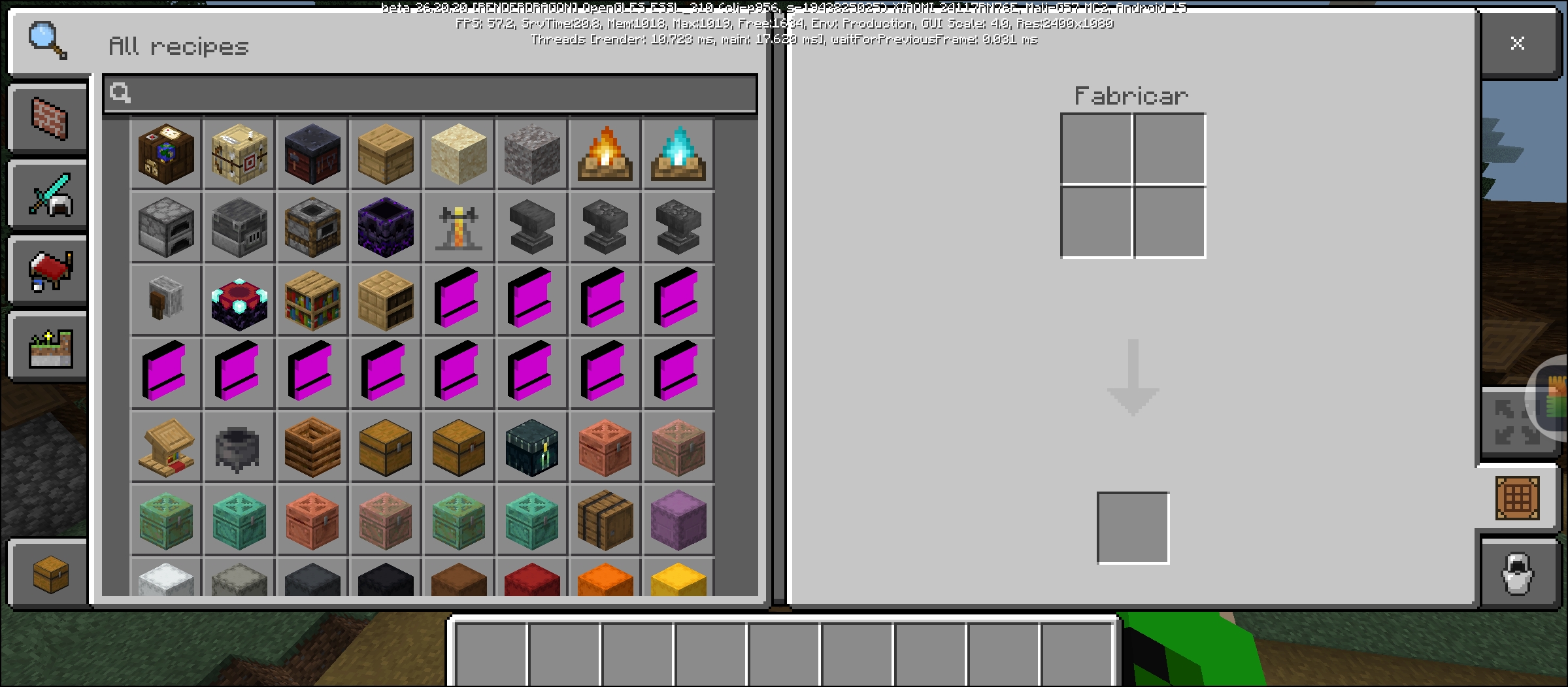 In the recipe book (All Recipes tab), several items are appearing with the default "missing texture" pattern (magenta and black squares). Based on the shape and position, these appear to be banners, shields, or specific decorative blocks that aren't loading their inventory icons correctly.