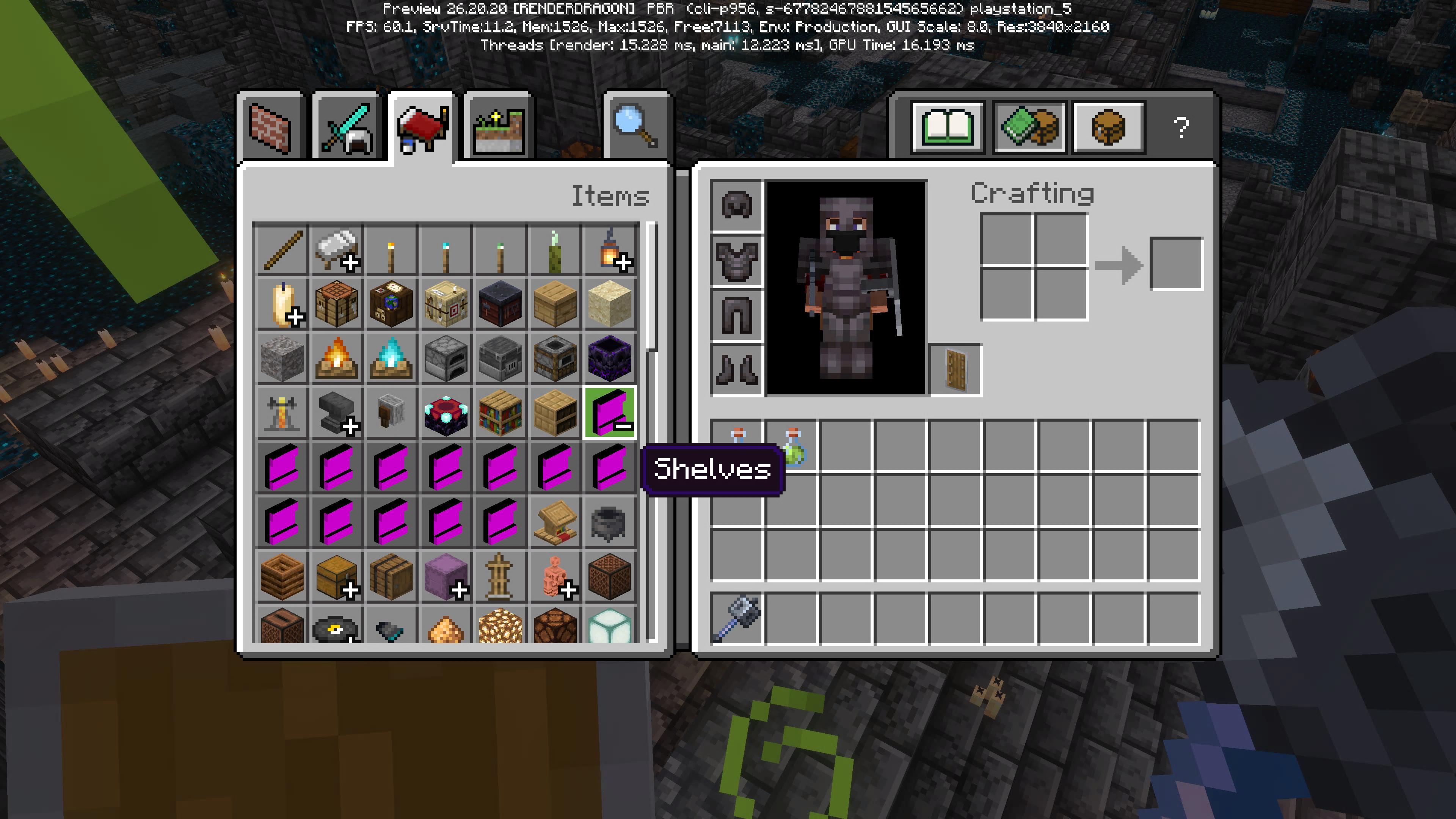 Under the items tab in the creative inventory, an object named “Shelves” appears. This item does not correspond to any official block or feature in the game and is listed alongside valid items such as candles, crafting tables, and furnaces. The item cannot be placed or used in the world, suggesting a bug in the inventory interface.