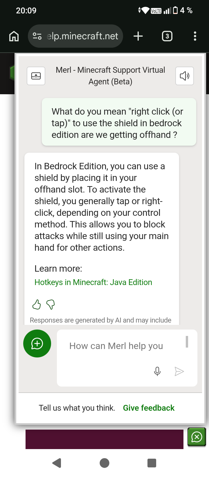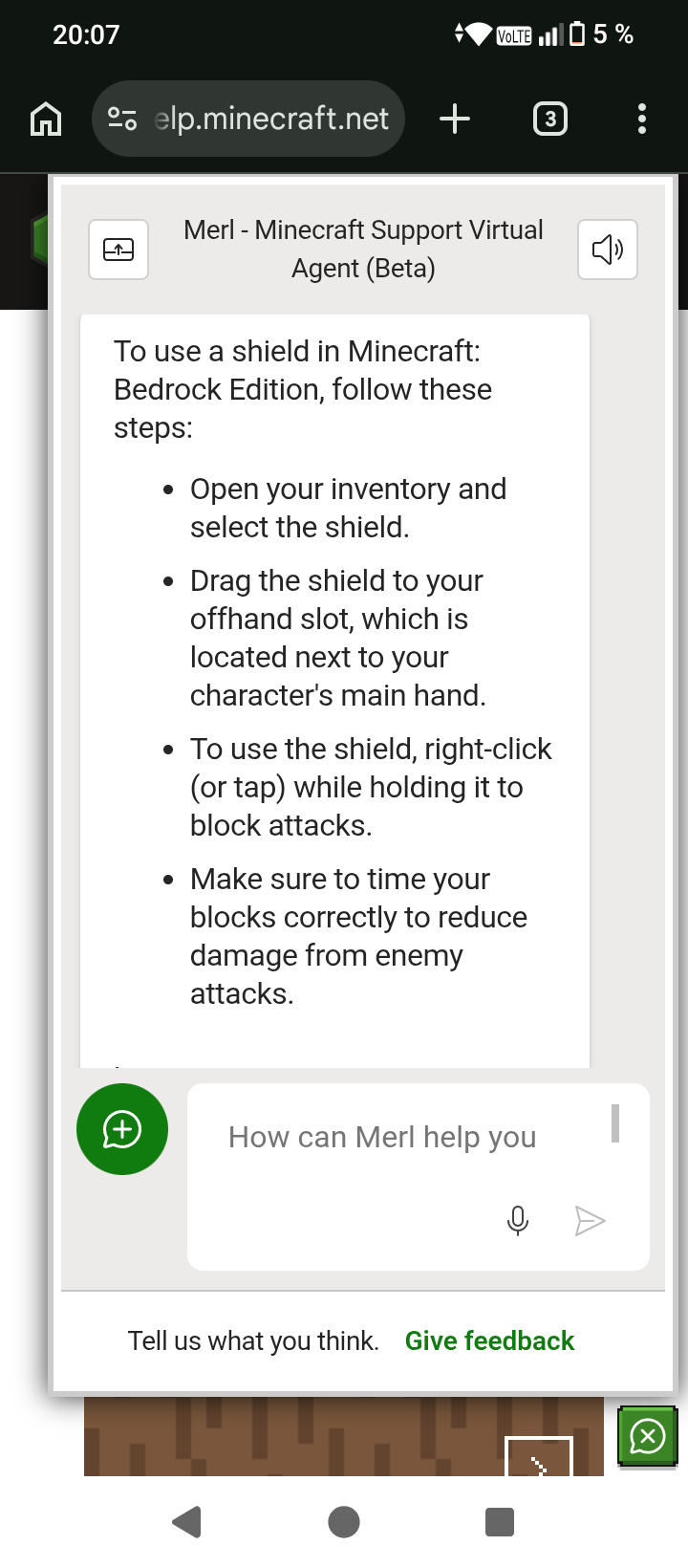 According to Merl we need to “right click or tap according to your control methode” to use the shield in the offhand and “being able to do something else with the mainhand”.