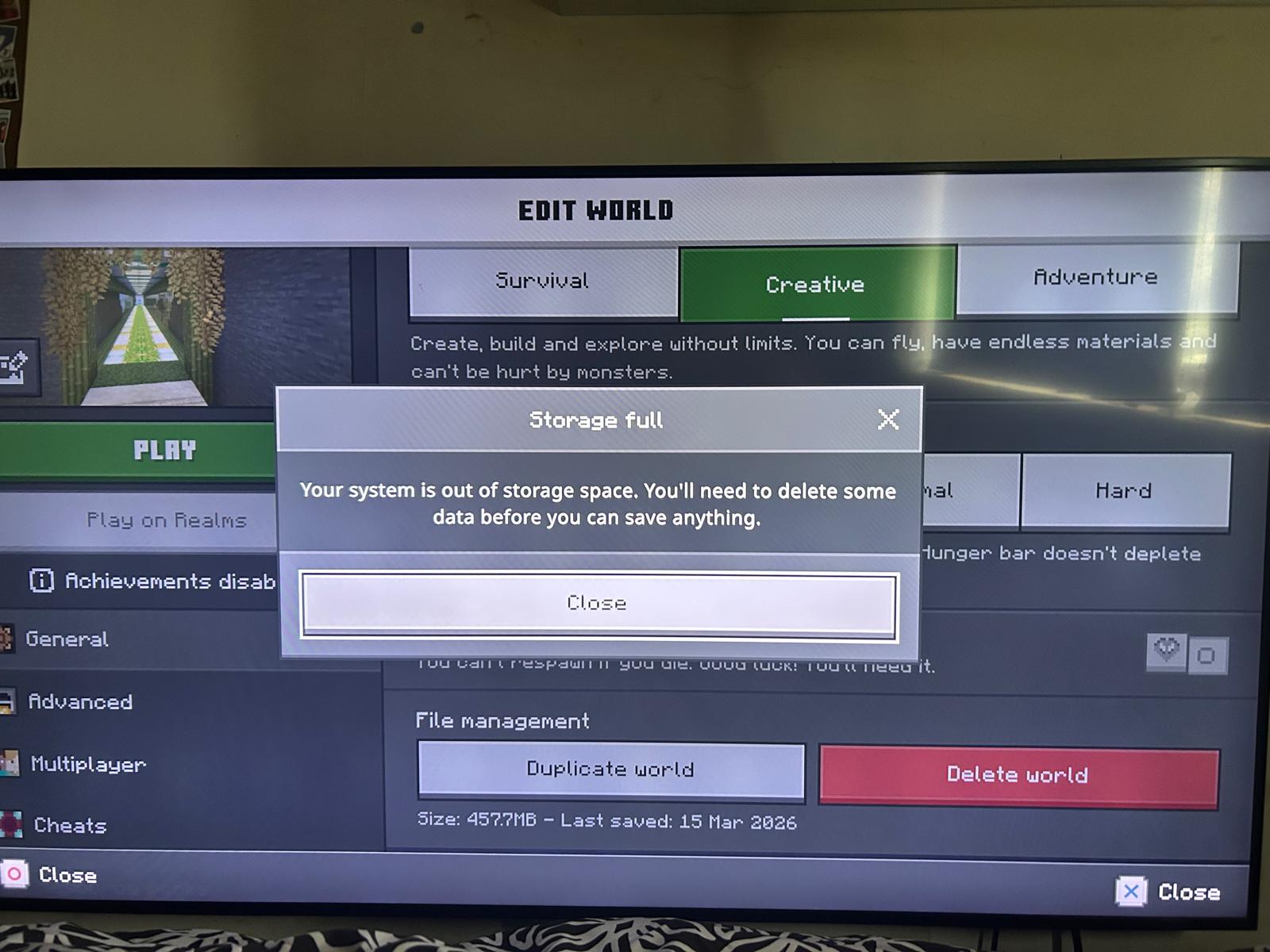 Game keeps freezing and crashing when I open my world, can hardly move because it glitches out stopping and starting every few seconds and sooner or later I get kicked out, it also says im out of storage which is also wrong because ive got about 200gb spare. Not been playing too long but i am a keen bullder, i love playing it! It's frustrating because I have spent months of hard work and effort creating in the particular world. Please could you try and fix this for me? I'd be grateful if so. Thank you.