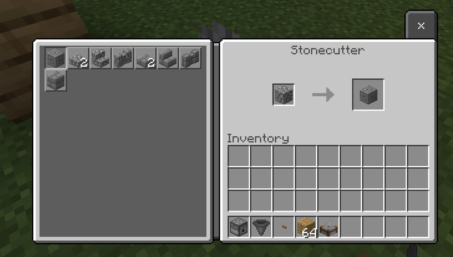 Put cobblestone block into the stonecutter and more than just the normal items can be made. Chiseled Stone Brick, Stone Brick Slabs (2x), Stone Brick Stairs, Stone Brick Wall, and Stone Bricks can also be made.