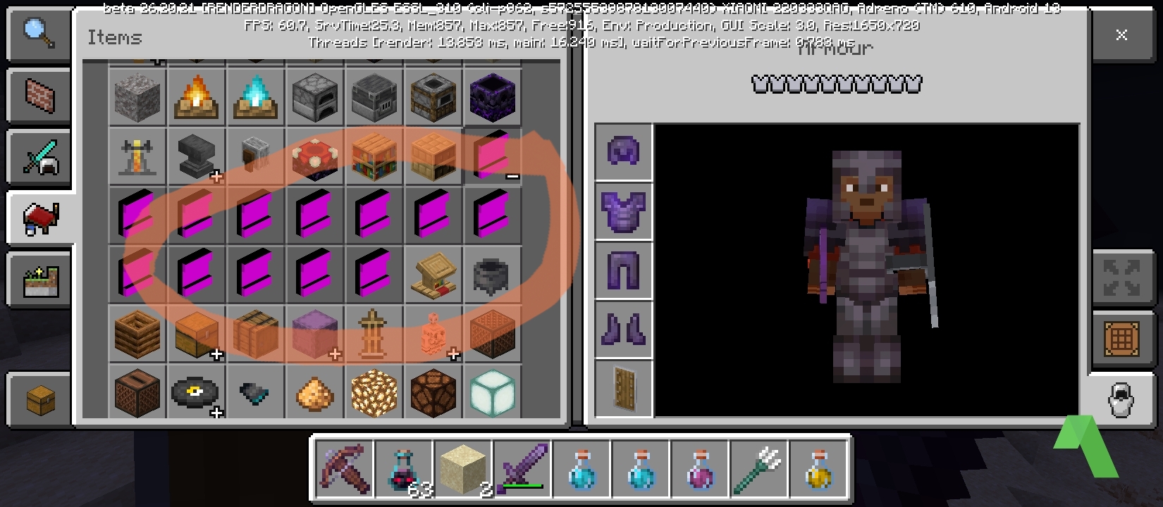 Short description: Inventory items show pink/black missing textures and UI header displays 'Self'.