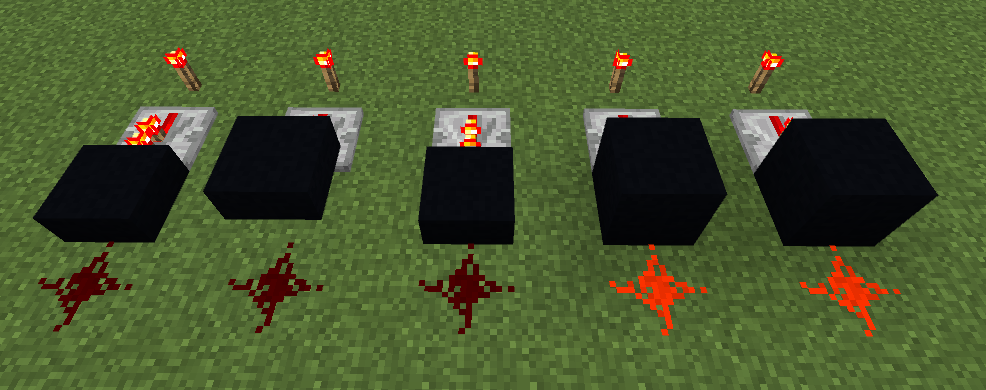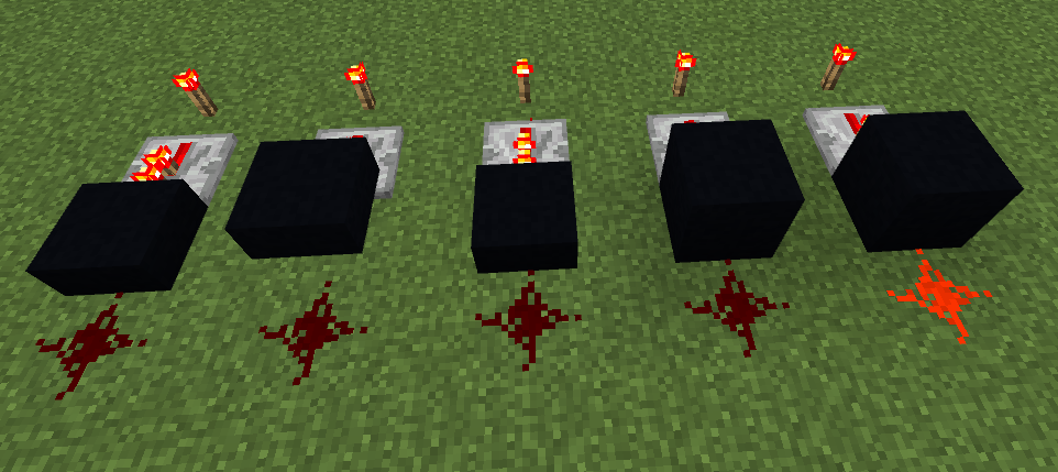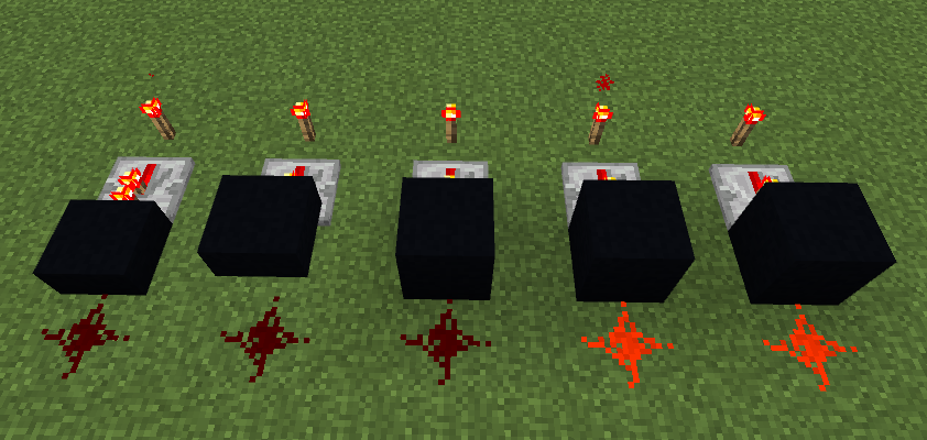 A block is shown to not conduct a redstone signal as a bottom slab (positions 1 and 3) or a top slab (position 2). Position 4 is a double slab placed through world interaction. Position 5 is a double slab placed by command to ensure it is instantly placed with the double-slab property that should facilitate conductivity.