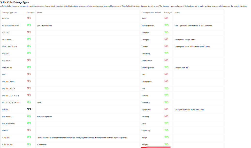 if there is a block in a sulfur cube, the sulfur cube can’t hurt by player, tnt, or arrow. but sulfur cubes still be hurt by some other reasons. Only /kill and the void should hurt it.