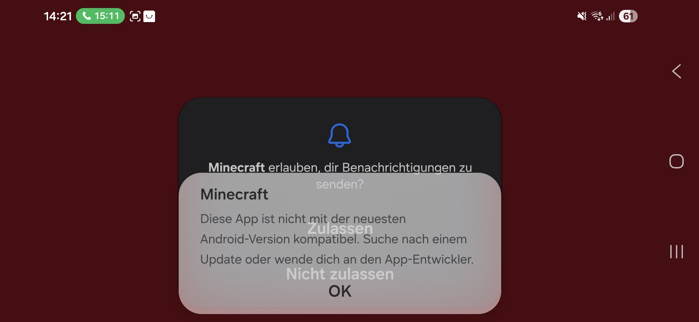 Ich habe ein Problem mit der App Minecraft auf meinem Android-Gerät. Beim Öffnen der App erscheint eine Meldung, dass die App nicht mit der neuesten Android-Version kompatibel ist. In der Nachricht steht, dass ich nach einem Update suchen oder mich an den Entwickler wenden soll.