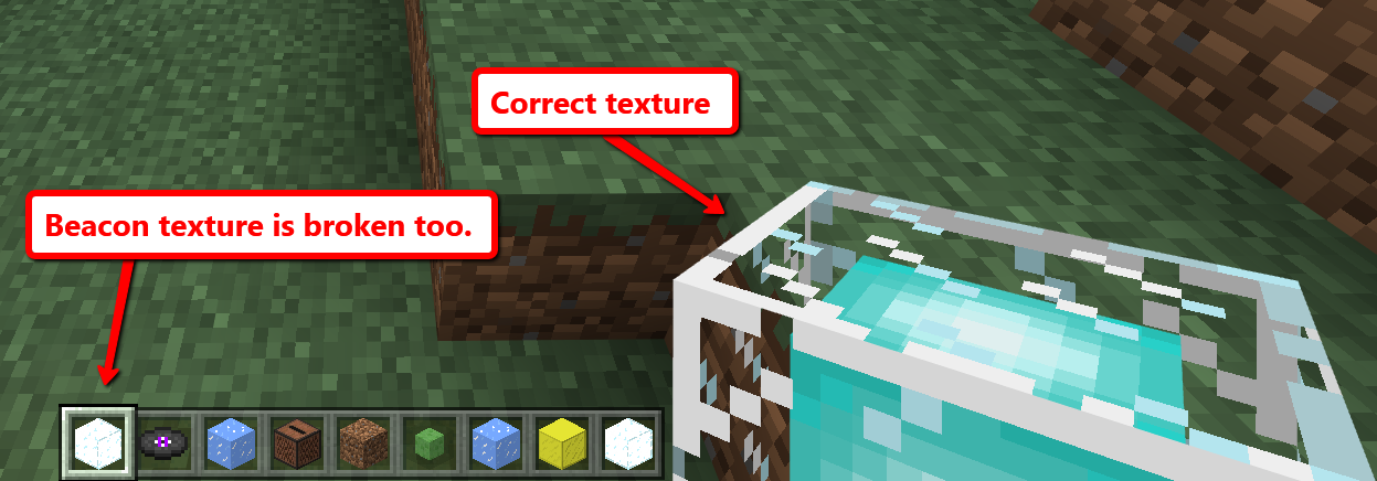 The texture sprites for beacons, glass blocks and glass panes are not transparent. They show a solid color. For example regular glass blocks and glass panes are completely white which is very odd.
