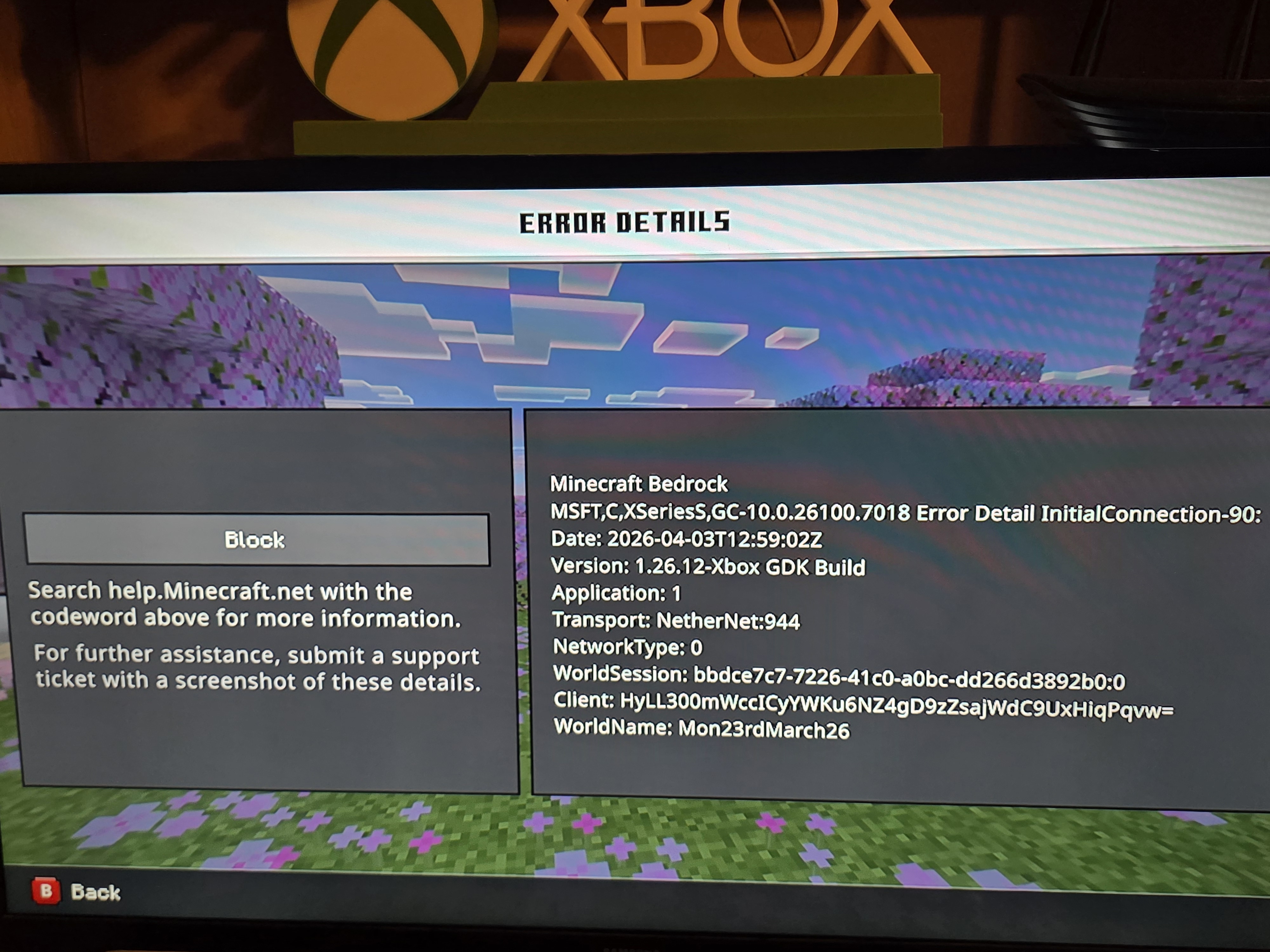 Upon loading a world I'm giving a “ an error has accurred” pop up, the details tell me the date, version, application, transport nethernet, network type, world session, client, and world name, however doesn't specify the flaw of the actual problem.