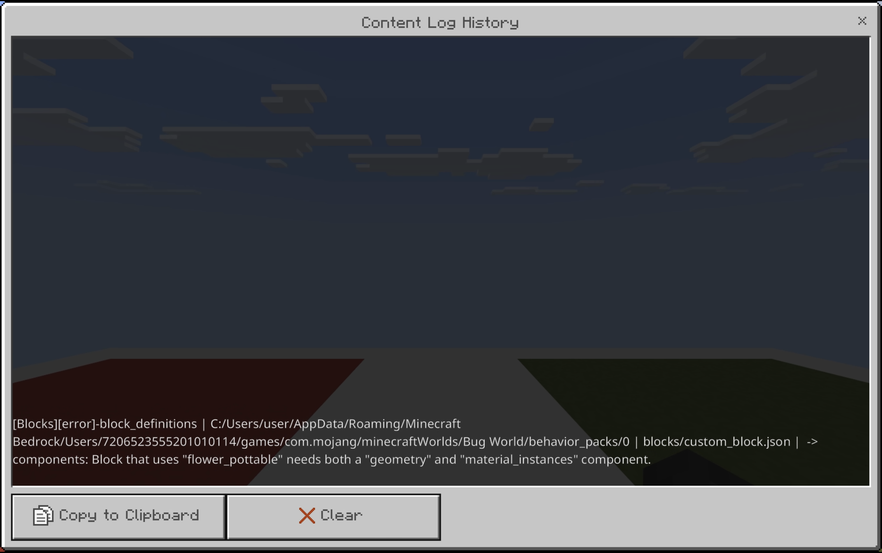 }The demo screenshot and code are taken from the behavior pack in the attached world for convenience. This world can be opened (in Minecraft Preview) for inspection or unzipped to access the code associated with such. Ensure that content logs are enabled with at least the “Warn” log level to see the error.