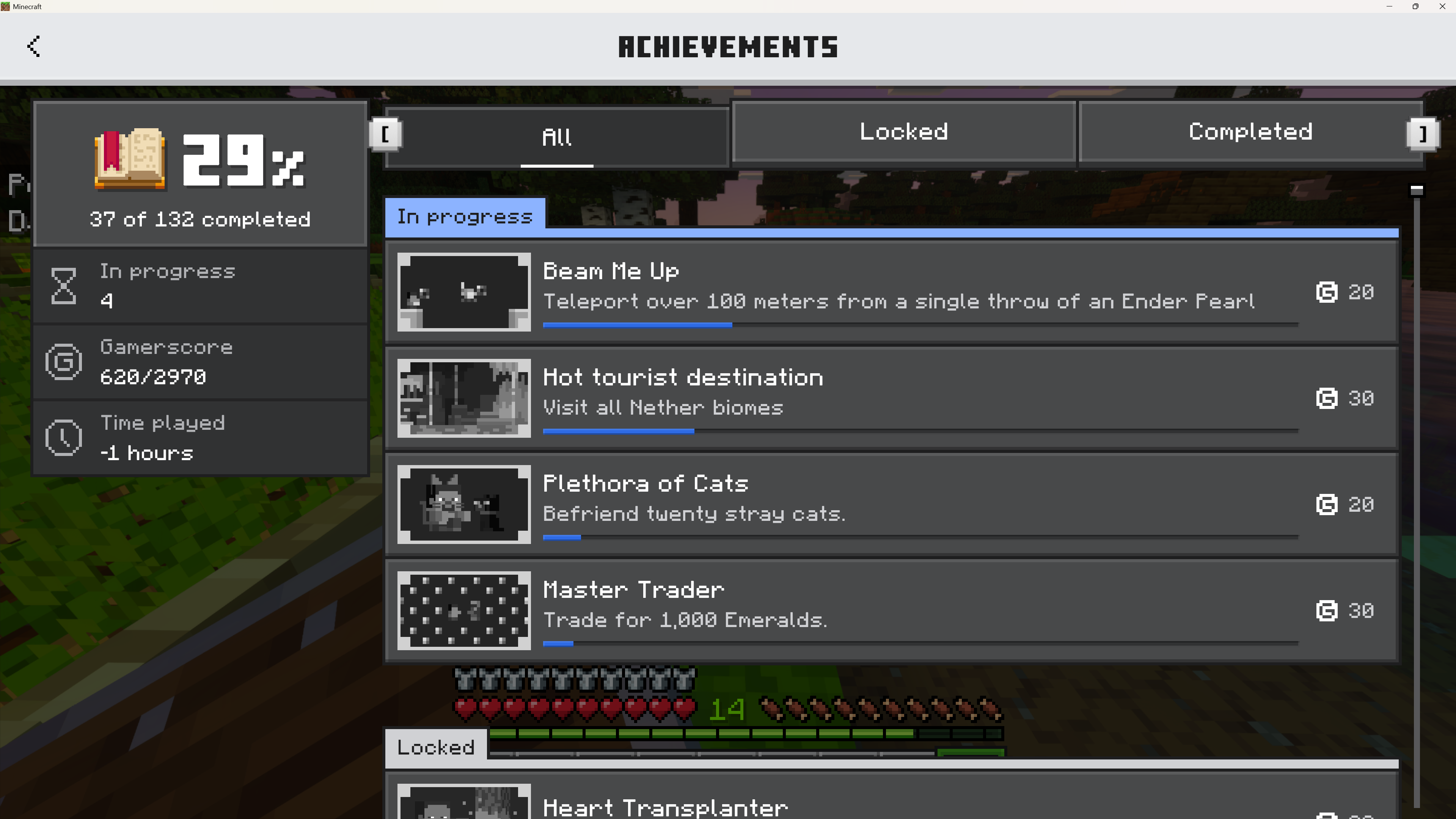 When viewing the achievement page in game, the playtime hour count shows as “-1”, achievements are not sorted by category, and the achievement sort option has completely disappeared. The correct playtime stat can be found by going to the main menu achievement page, but the achievement sorting still does not work.