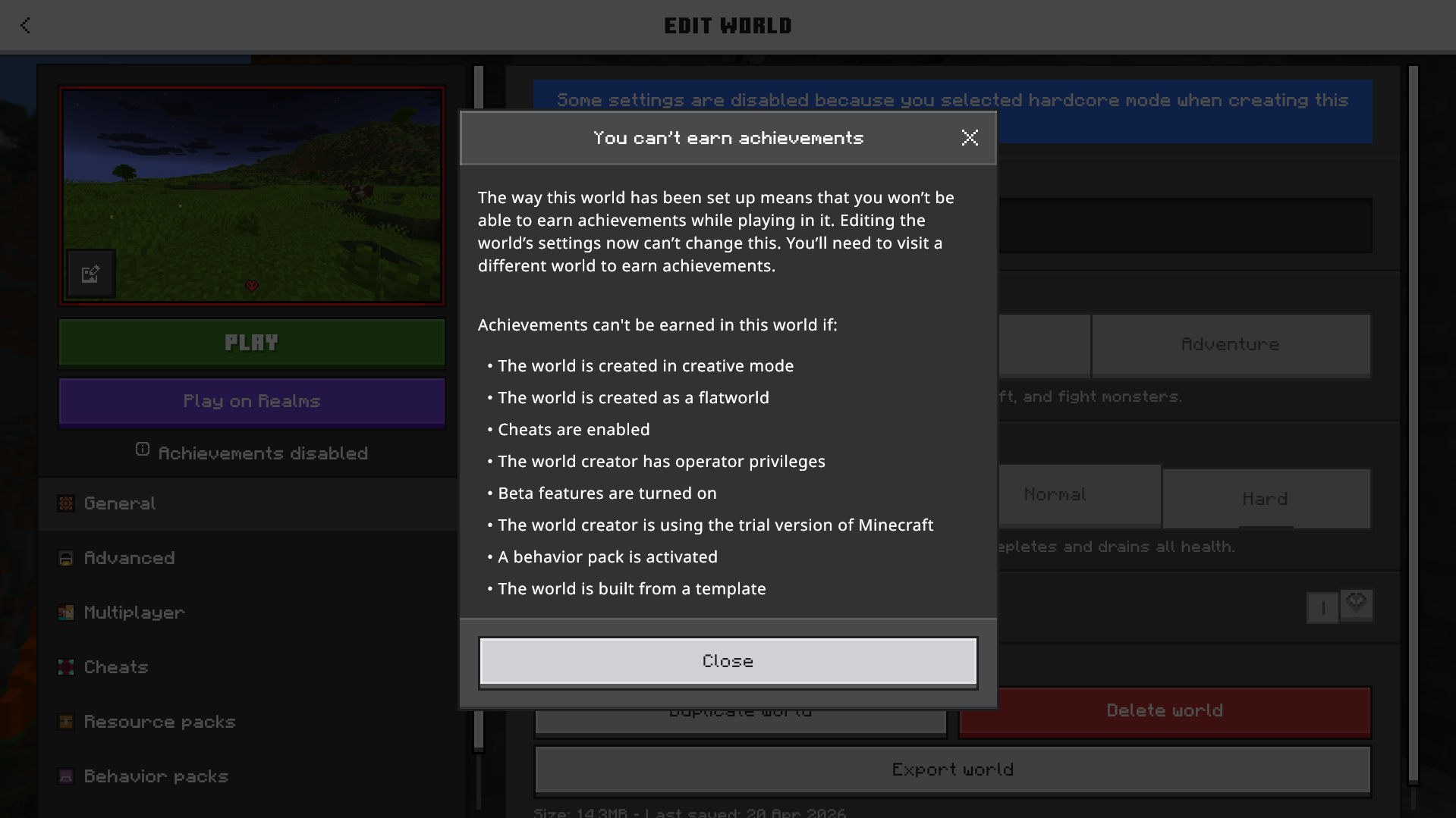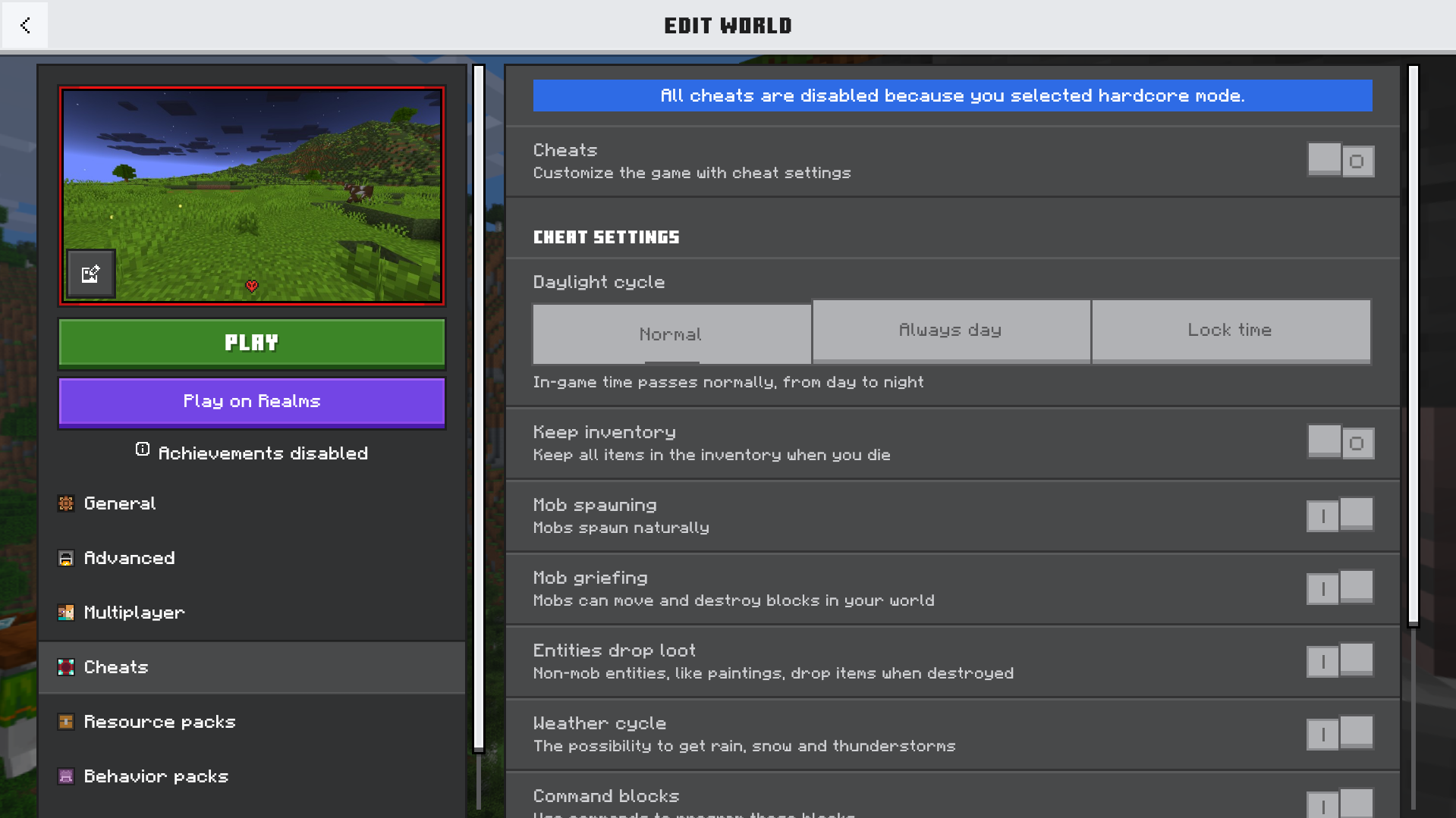 My Hardcore World suddenly got flagged as Cheating with a bunch of signs that I don't remember toggling at all. Iām annoyed by this bug so hopefully you fix this