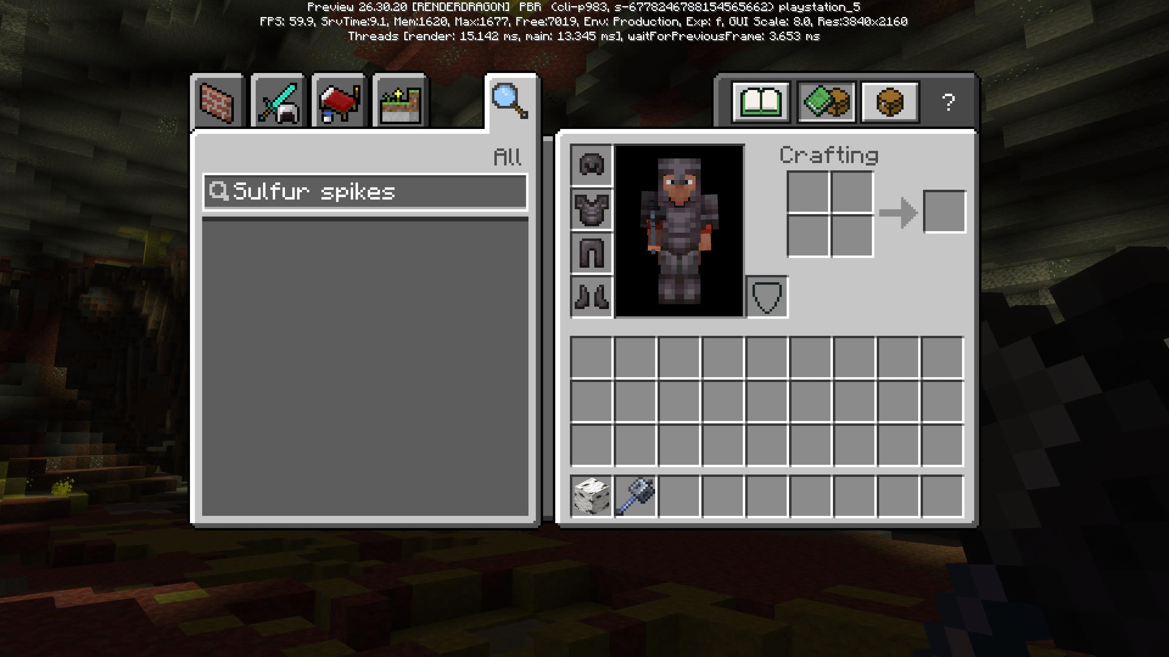 The newly added item “Sulfur Spikes” does not appear in the inventory or search tab, even though it is included in the latest preview (26.30.20). Players are unable to find or access the item through normal gameplay interfaces, suggesting it may not be properly registered or enabled.