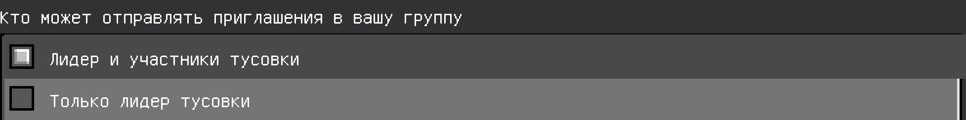 The UI uses both "группу" (group) and "тусовки" (slang for party) in the same menu. "Тусовки" should be replaced with "группы" for consistency and a more professional tone.