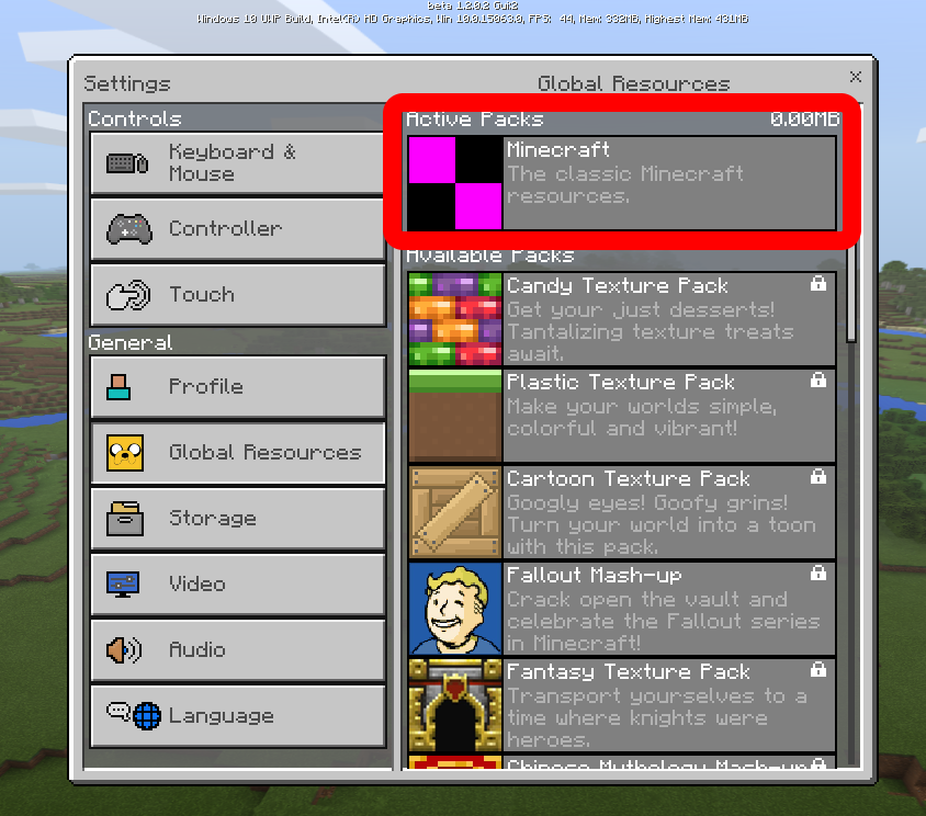 There is no Default Minecraft Icon Texture in the Settings in the Tab Global Resources.