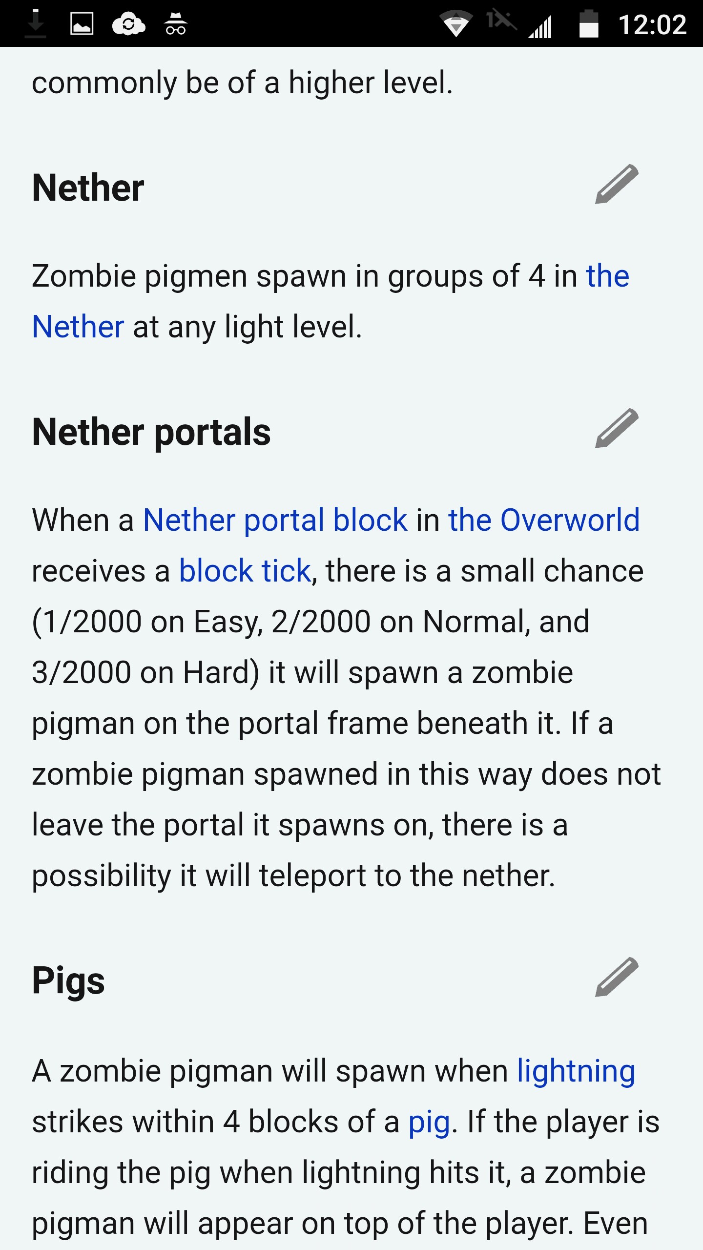 Zombie pigman are not spawning in nether portals, I have 2 sets of 16x16 portals set up and have waited 30 mins without a single spawn. I have made a report like this last version, and it was labeled as a duplicate, even when it was the only report of it's kind, the only other similar one was that zombie pigman DID spawn, but didn't transfer through the nether portals... However that was not my report, and this is a basic game mechanic that works on Xbox and pc, and used to work in previous versions before the 1.2 beta started. Hopefully this can be fixed in the next update 🙂 and yes, in these screenshots I am in hard game mode, which according to the wiki means I should have a 75% chance on average that for every tick I should have at least 1 zombie pigman spawn