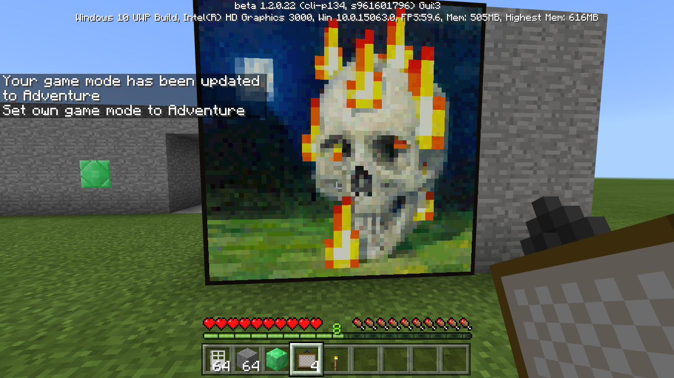 While creating a custom map, I tested out whether I was able to break picture frames. After switching to adventure mode, I was able to hit the frame causing it to break and drop. I am not sure if this is actually a bug or is intended. However, this action is bothersome as it makes it impossible to create hidden doorways behind pictures as the player only needs to hit the pictures to see what is behind them. The command /entitydata is also not available (yet?) in MCPE/Win10, so {invulnerable:1} cannot be used.