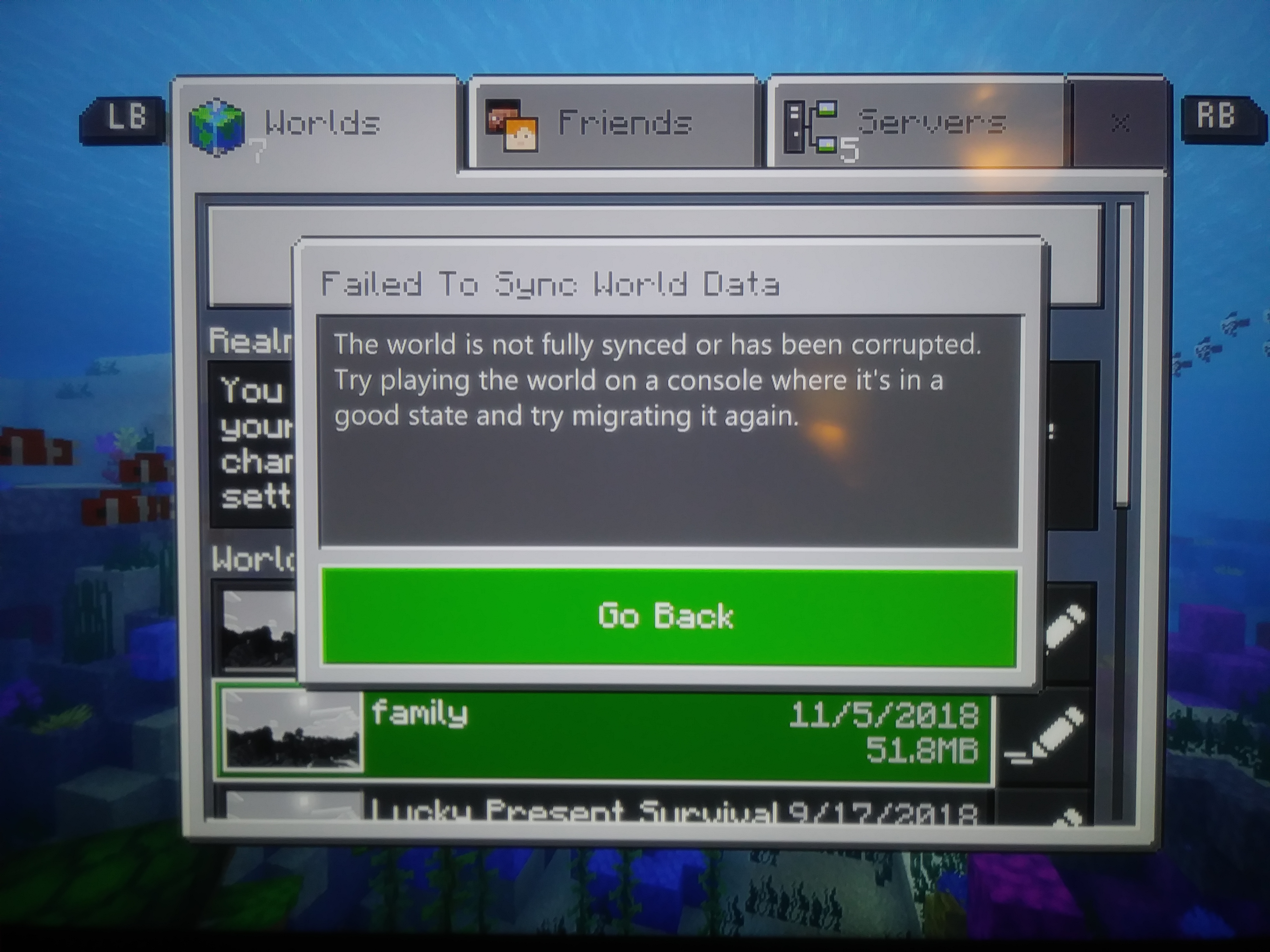 on November 5th. We could not get on because of Microsoft having issues. Ever since then I have been getting these messages. That it could not fully sync the world or the file is corrupt.ย Try play on another console and then try migrating again.ย This did not fix anything. I have removed my profile from the console. I have deleted the data stored on the counsel and then removed my profile. And nothing is working. After doing both of these with out working, I am now getting a message that says I can use realms because of my Xbox live privacy settings but everything is allowed.ย The world still syncs to 97% the stops.ย Plese help!!