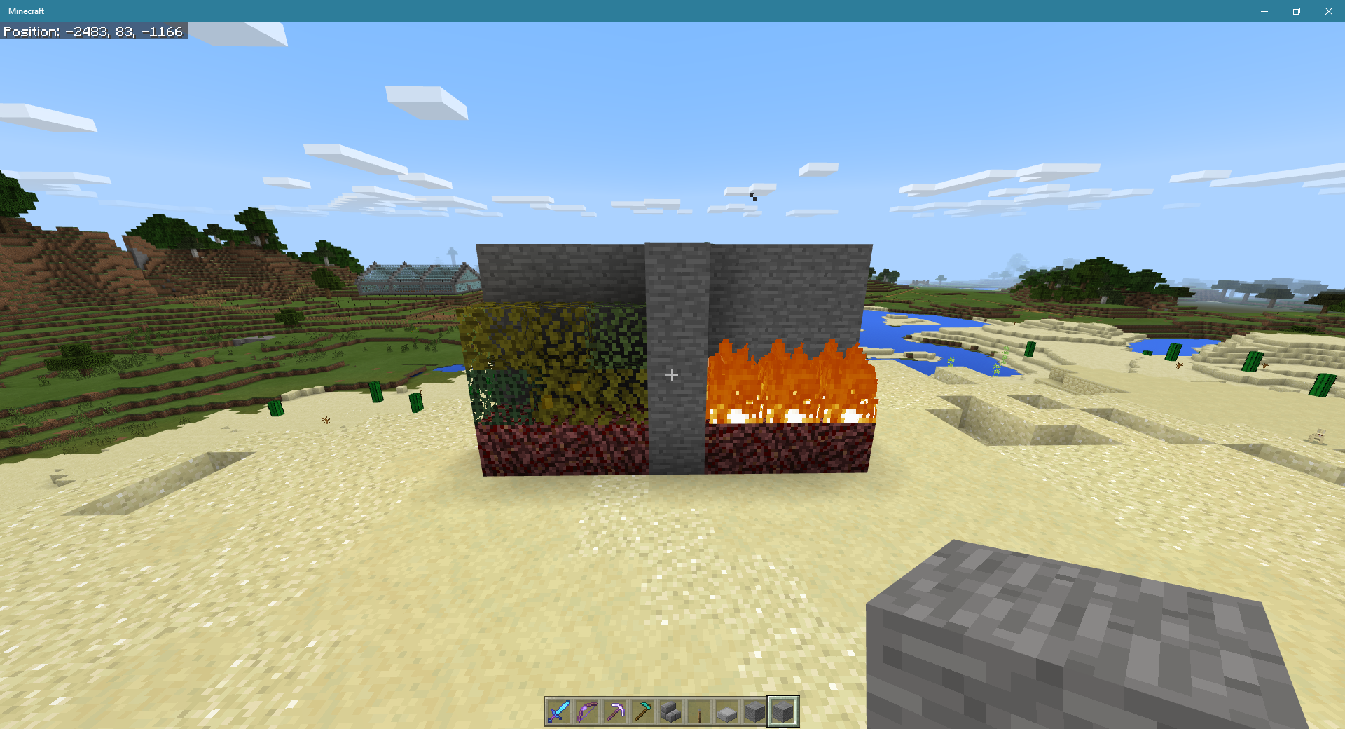 From the other side.png shows how I arranged a stone wall with fire and all 6 kinds of leaves. The fire and leaves are at X = -2476.