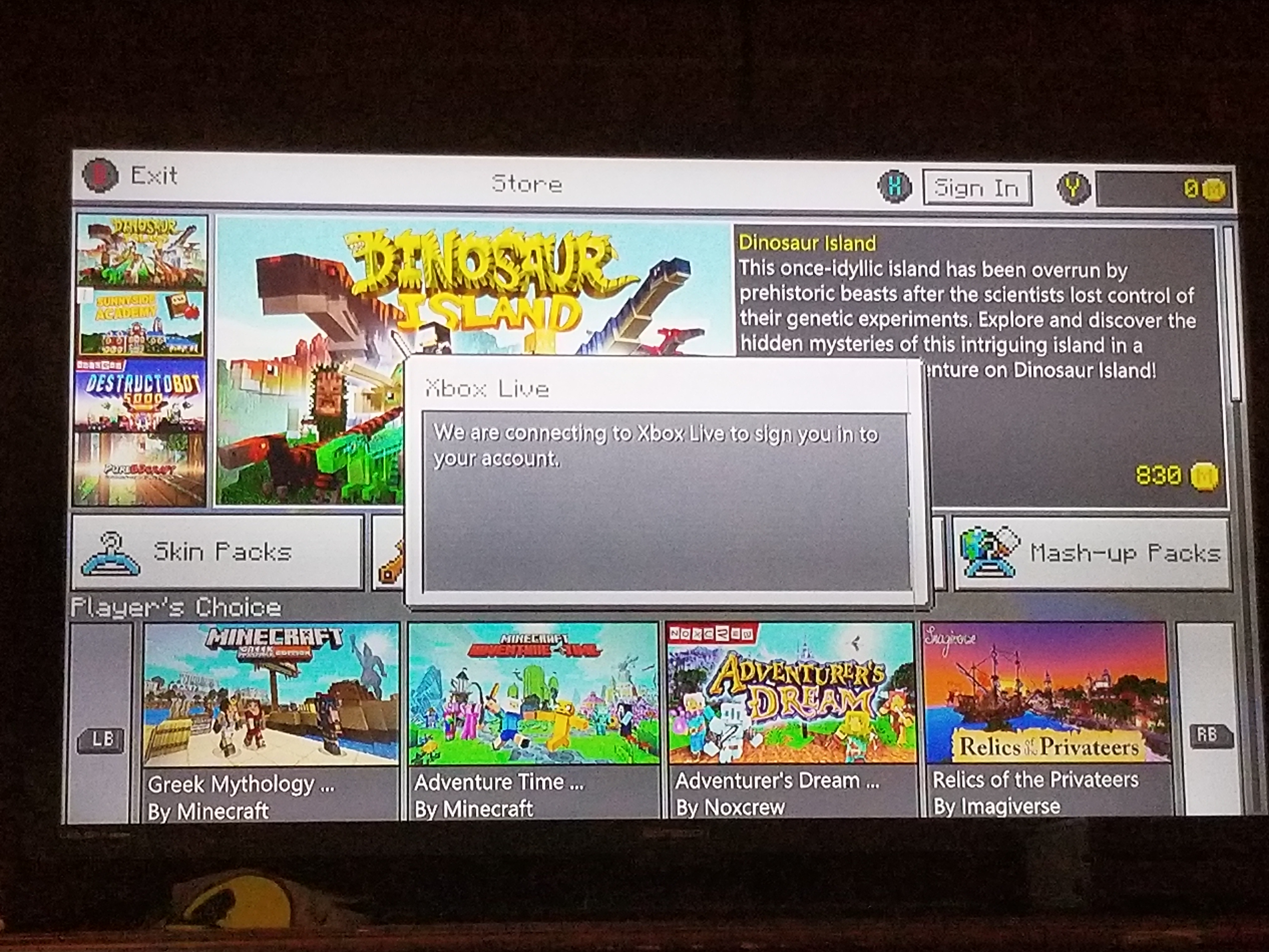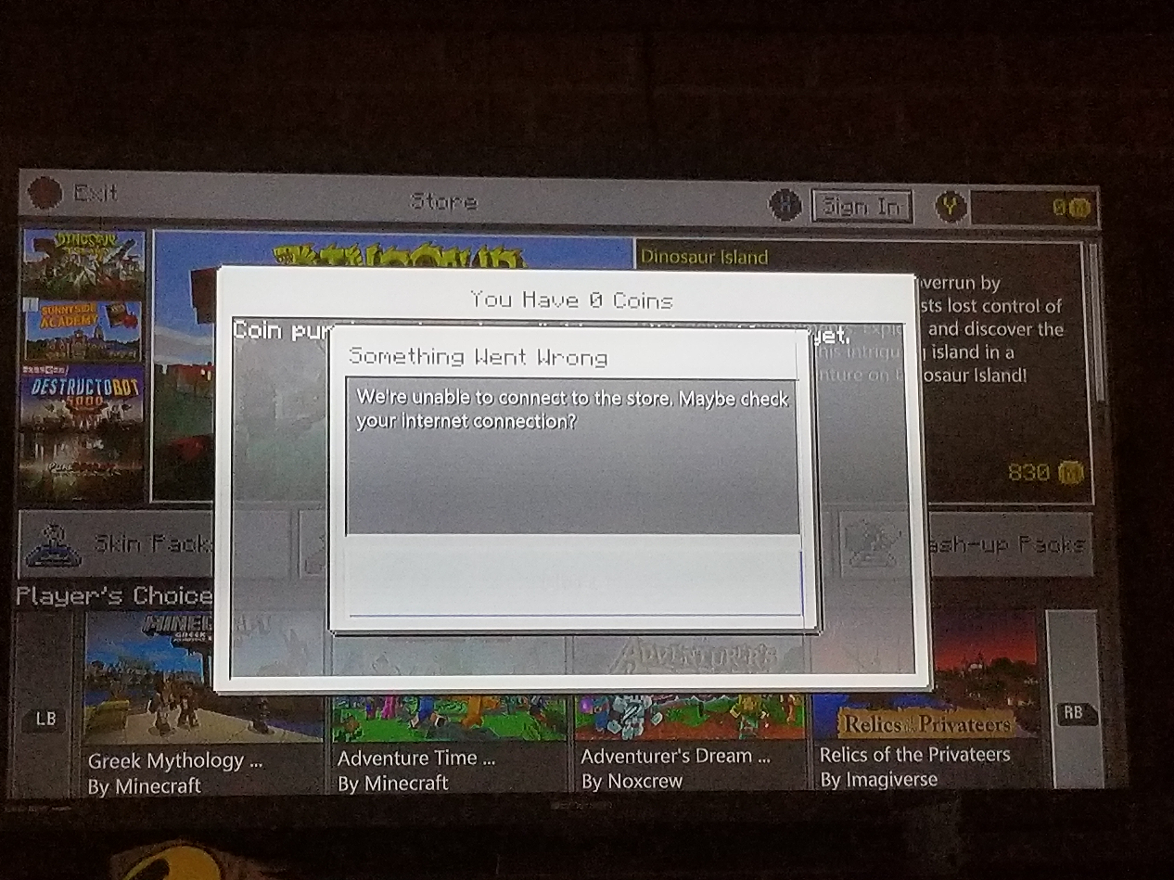 Everything for the game (I haven't checked playing online multiplayer because I have no one to play with who doesn't live with me, so...) works fine EXCEPT for logging into the Minecraft store. I have uninstalled and reinstalled the game. Power cycled. Fully removed my Xbox live account and re applied it. Full reset of the Xbox itself. Hard lined the internet connection to ensure it's fast enough (cause all it suggests when it fails is an internet connectivity issue). I can create new games, convert old ones to the new infinite format, everything works great except for the store. I just want my natural texture pack. I'll even buy it again! It just won't let me.