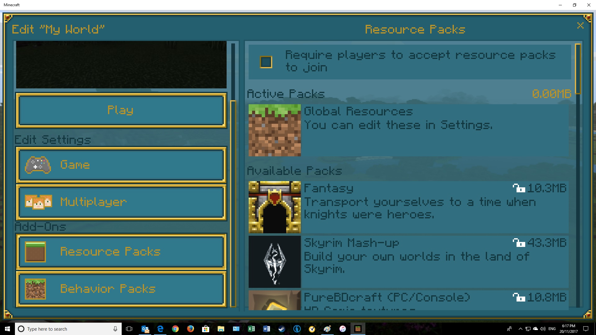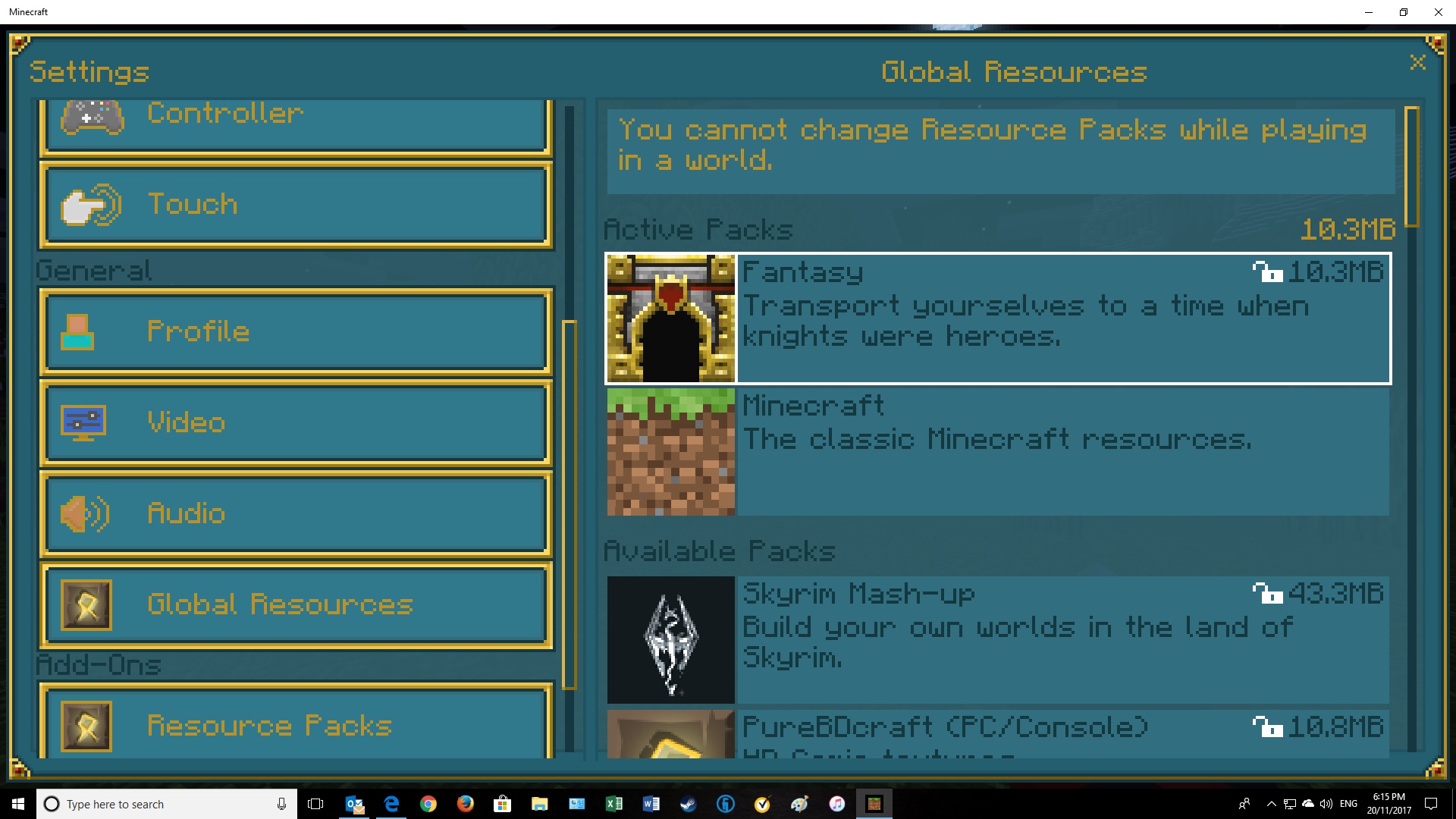 I removed a resource pack (BDCraft) so that my only resource pack running was the default one but the game continues to display another texture pack (Fantasy). If I try to remove it in game (it appears under Global Resources) it tells me I can't remove resource packs while the game is running, so I save and quit, but when I try to change it under resources it now shows that only the default is loaded. Going back into the game and Fantasy resource pack is still loaded even though the game tells me default only is loaded. I am unable to remove the Fantasy Pack from 'Global Resources'. Any ideas how I can do this?