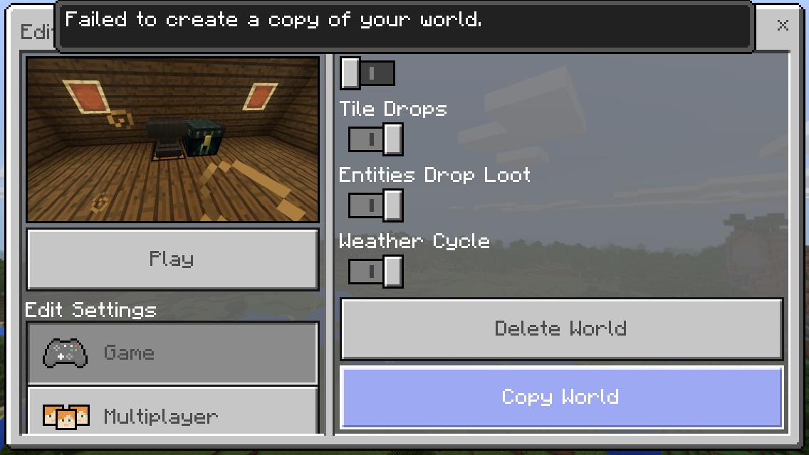 When I try to copy my world it will try to copy it for a few seconds an then it tells me it can’t (this also means I can’t play with experimental gameplay in this world)