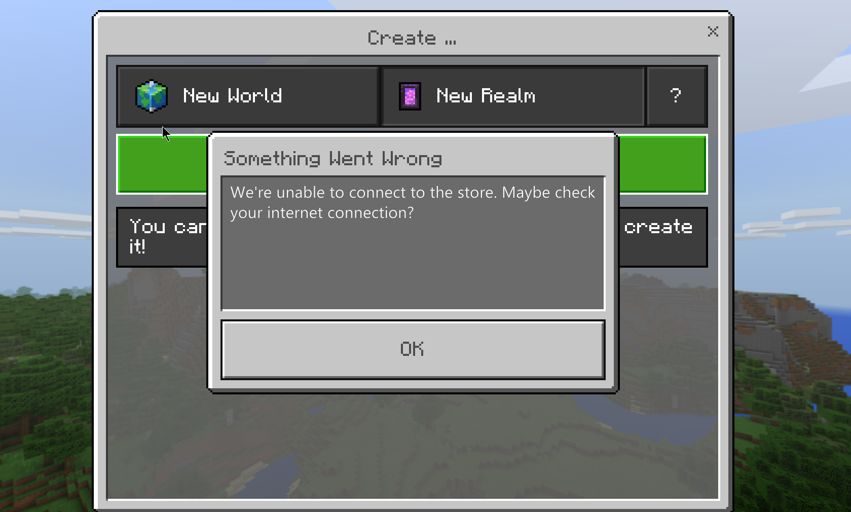 When attempting to create a realm; I receive an error message as shown below. The internet is fully operational, and I am able to invite other players to a world of mine. I am just unable to create a realm or sometimes access the store, although it allowed me to access the free gifts from the store at Xmas.