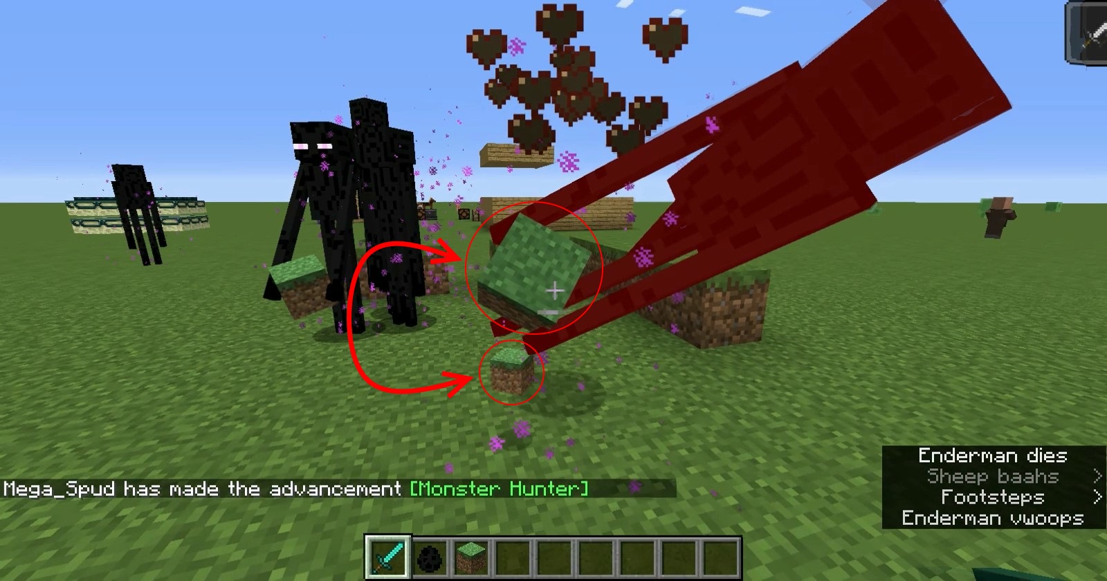 Endermens' hand is still holding the block though the block has been dropped as an item.