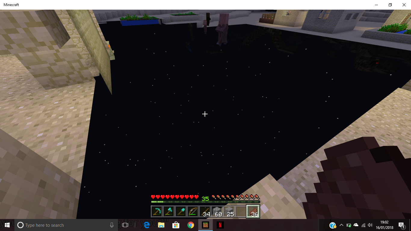 Sometimes, when moving around on Minecraft, the land doesn't properly form (as shown in the screenshots), leaving a blue kind of area, with little white bits. A player can walk on the space as well as other mobs such as villagers, except that they do glitch out, doing this. A player can also walk on the space but it either traps them under the surface (if it's water), or it glitches them out like mobs. It happens rarely though and has only bugged out twice for me so far.