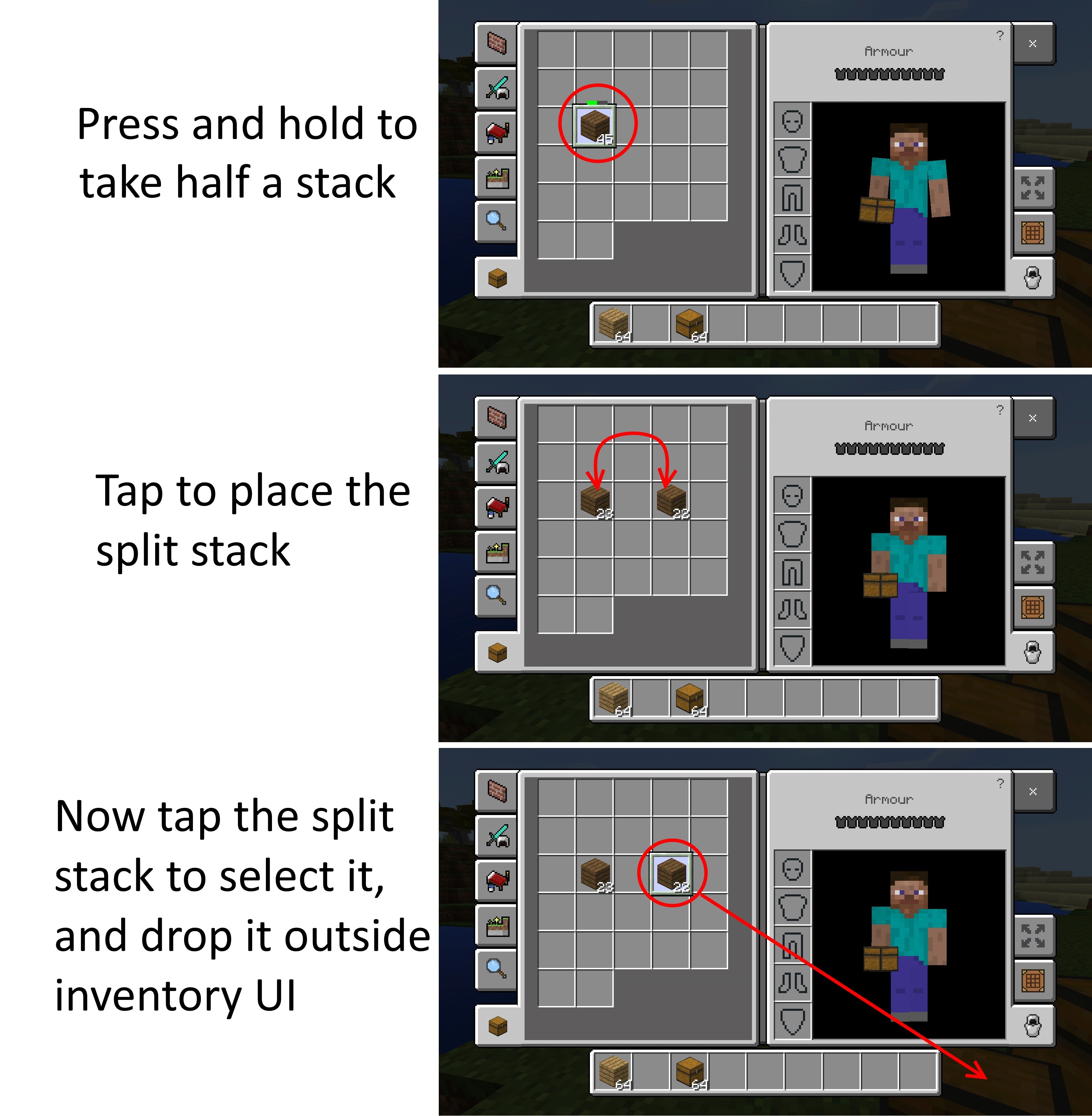 In the inventory, when I try to pick up part of an item stack by pressing and holding it, and I try dropping the part of the stack without closing the inventory between when I separated the stack and dropped the part of the stack, I drop all the items of the original stack.