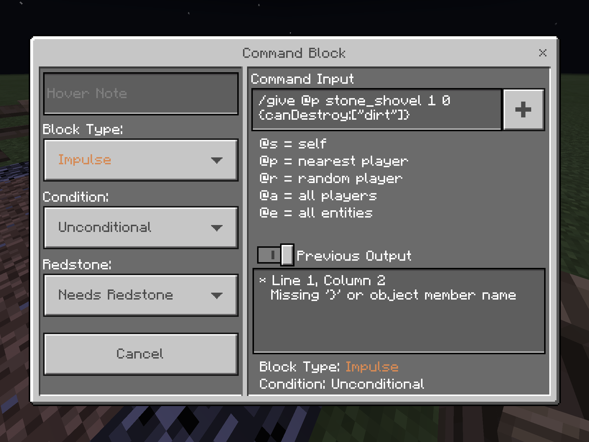 I was typing a stone shovel to break only dirt for my adventure map but i know I typed it correctly but still giving a line 1 column 2 error