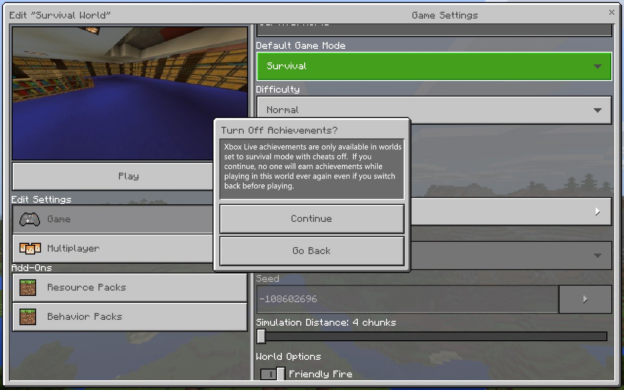 Samsung Galaxy Tab 4 - Have one survival world where achievements are there... but when looking at cheats ( disabled ) but the keep inventory is enabled. Don't know what happened but want to play "ligit" so trying to turn it off