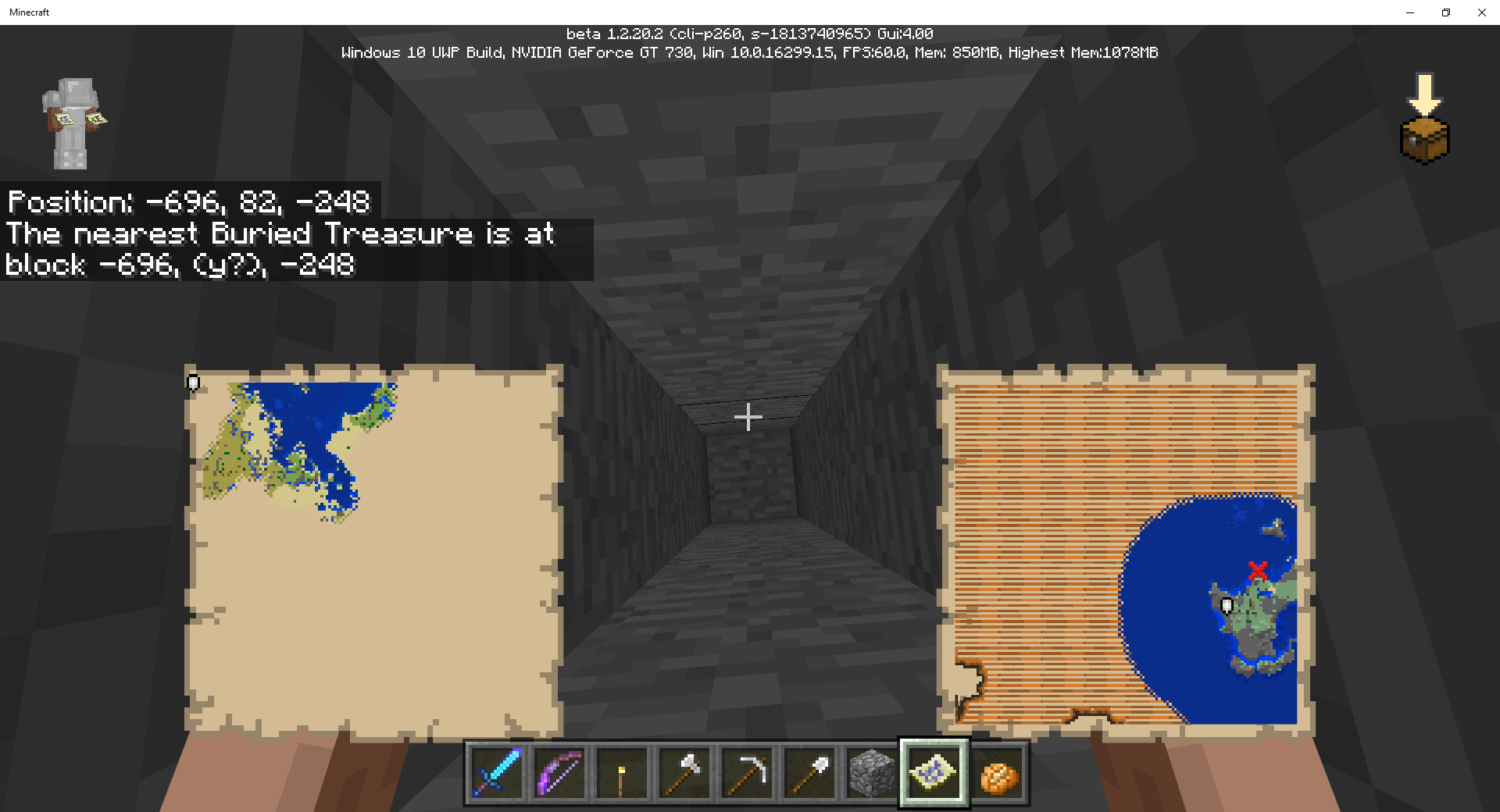 I have tried several other treasure chest maps in this seed, but none of the maps produced a treasure chest. Here's another case: Ruins at x=-543 z=-202 with Treasure Map Red X; but Locate command shows x=-696 z=-248. No treasure chest at either location, refer to attachments.