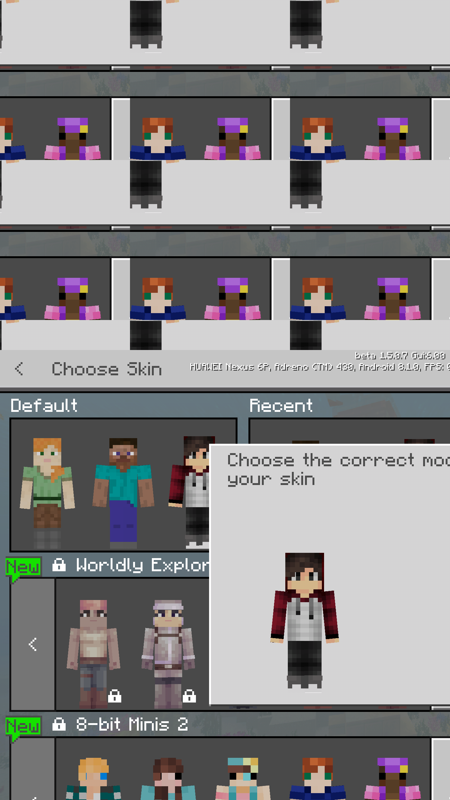 When Auto-Rotate is turned off and when you try to select a custom skin from images on my Nexus 6p the photo selection is in portait after selecting the corresponding skin Minecraft reappears in portrait mode and the whole UI breaks and glitches.