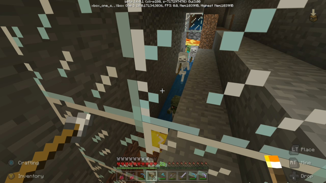 XP trap combines Skeleton spawner that drops mobs down from above and Zombie Spawner that transports mobs via water through a lava blade. Mobs had accumulated in the trap before the upgrade from 1.5.0.10 to 1.6.0.1. After the upgrade to 1.6.0.1, some of the mobs (two skeletons, a zombie, and a juvenile zombie villager) began bouncing off edge of the trap where the mobs had accumulated and shooting back up to the head of the water stream. Recording at 30fps (video available upon request), it took the mobs 105 frames to float down the water stream from below the lava blade, and 15 frames to travel back to the top of the water stream.Β The screen shots show the zombie shooting back up the water stream; they are frames 0 (Still 001), 4 (still 002) and 10 (Still 003) of the quick trip.