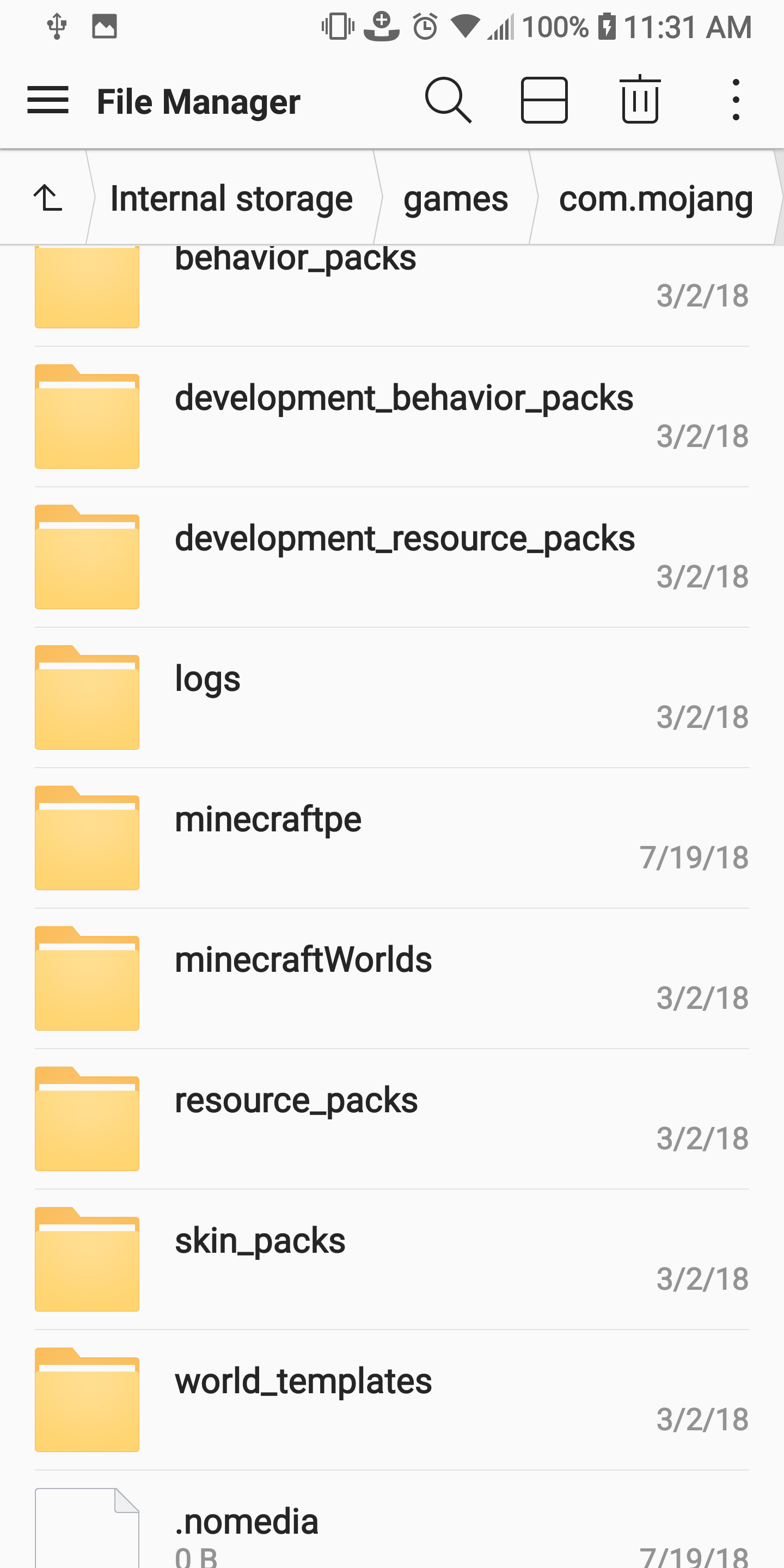 I do have a file manager app on my LG V30+ that will allow me to view the internal storage and I can see in the root there is a games folder. Within it there is a com.mojang and from within there I have additional folders (attached to screenshot) but I'm not sure if there is anything relevant to help with determining the lingering issue of not being able to open it. I have opened the logs folder, but there are no files.